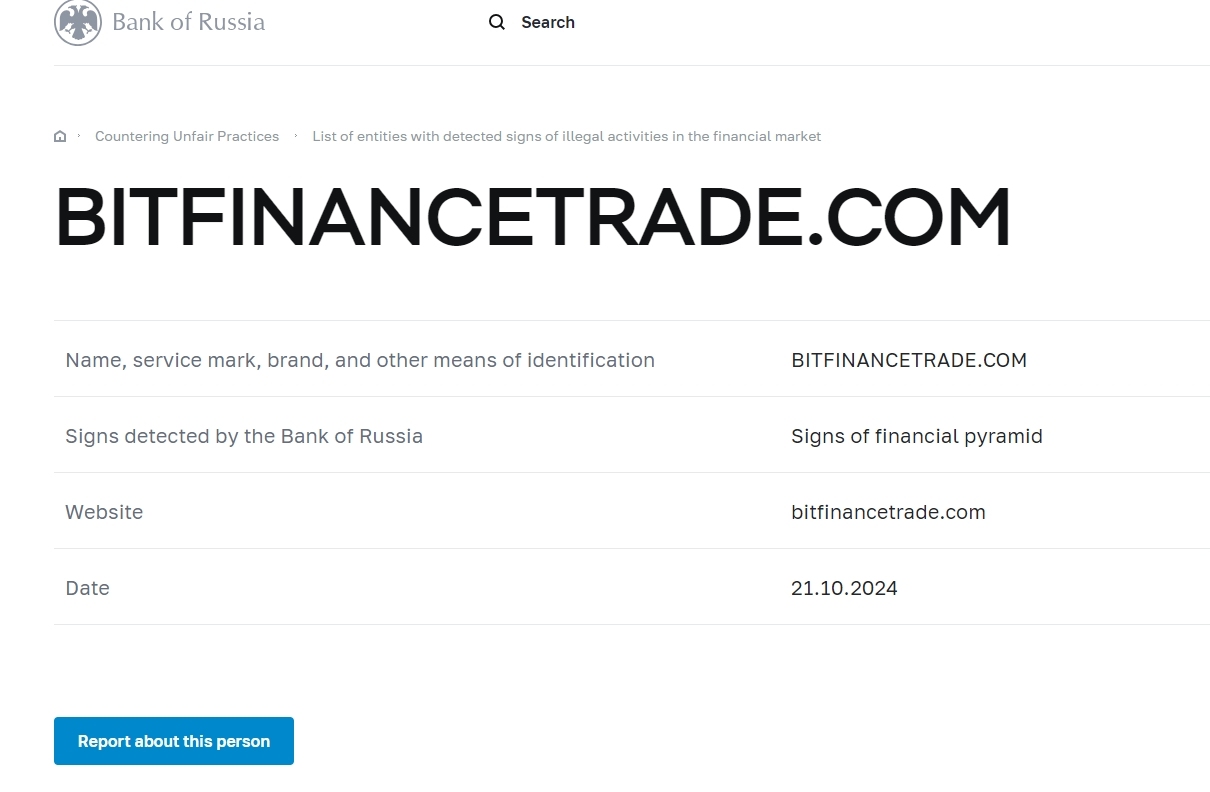 Наименование, знак обслуживания, бренд и иные средства индивидуализации BITFINANCETRADE.COM Признаки, выявленные Банком России Признаки финансовой пирамиды Сайт bitfinancetrade.com Дата 21.10.2024