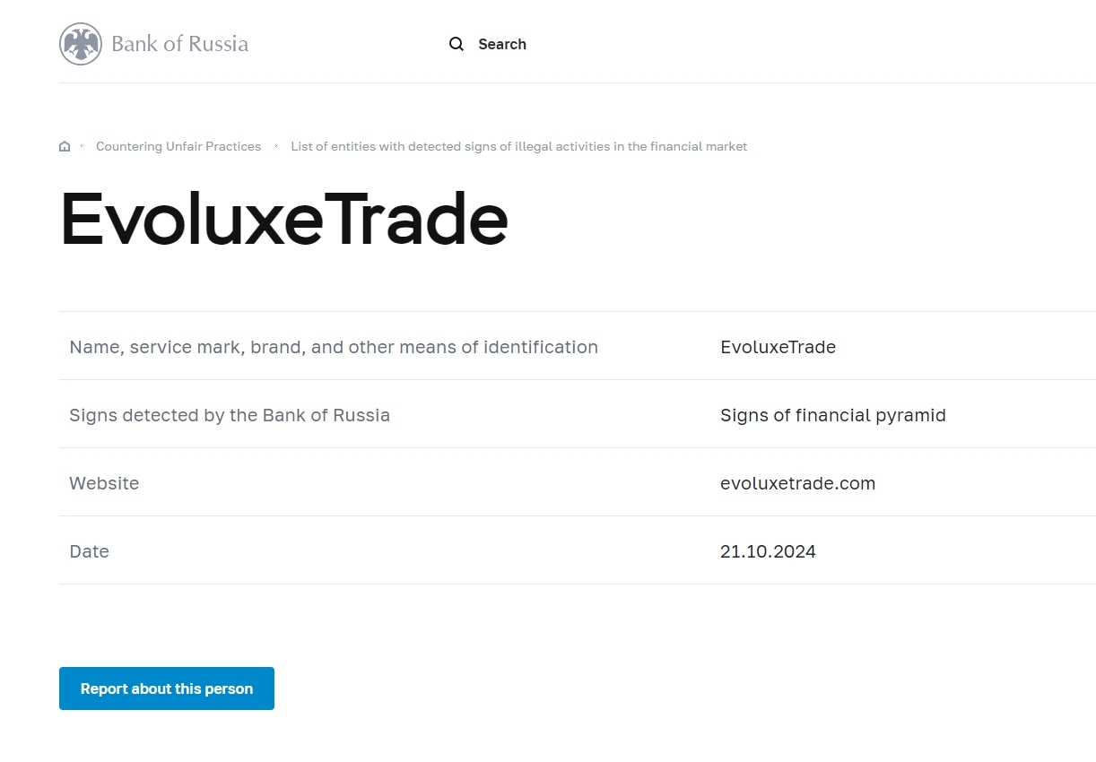 наименование, знак обслуживания, торговая марка и другие средства индивидуализации EvoluxeTrade признаки обнаруженные банком россии признаки финансовой пирамиды сайт EvoluxeTrade .com дата 21.10.2024