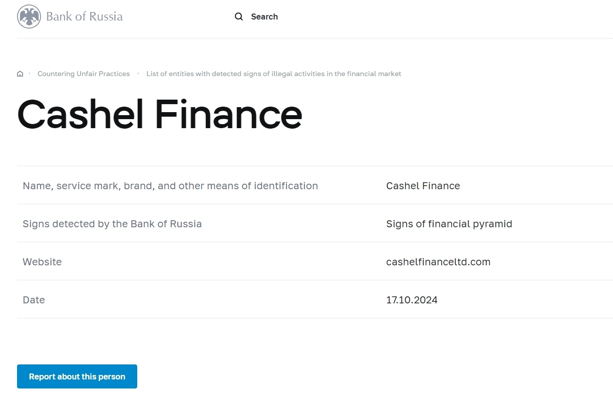 наименование, знак обслуживания, торговая марка и другие средства индивидуализации Cashel Finance признаки обнаруженные банком россии признаки финансовой пирамиды сайт cashelfinanceltd.com дата 17.10.2024