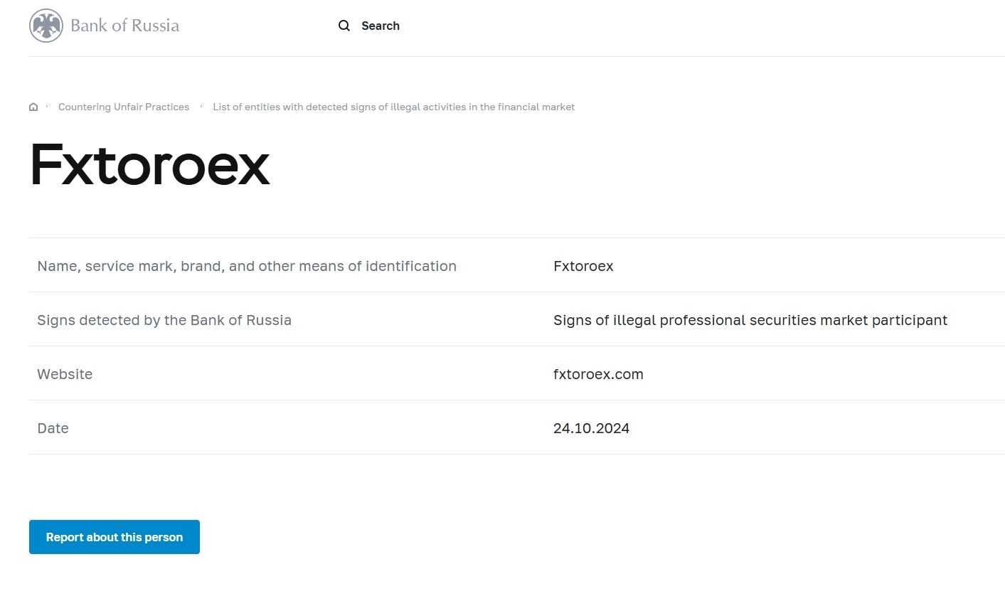 наименование, знак обслуживания, торговая марка и другие средства индивидуализации Fxtoroex признаки, выявленные банком россии признаки незаконного профессионального участника рынка ценных бумаг сайт Fxtoroex .com дата 24.10.2024