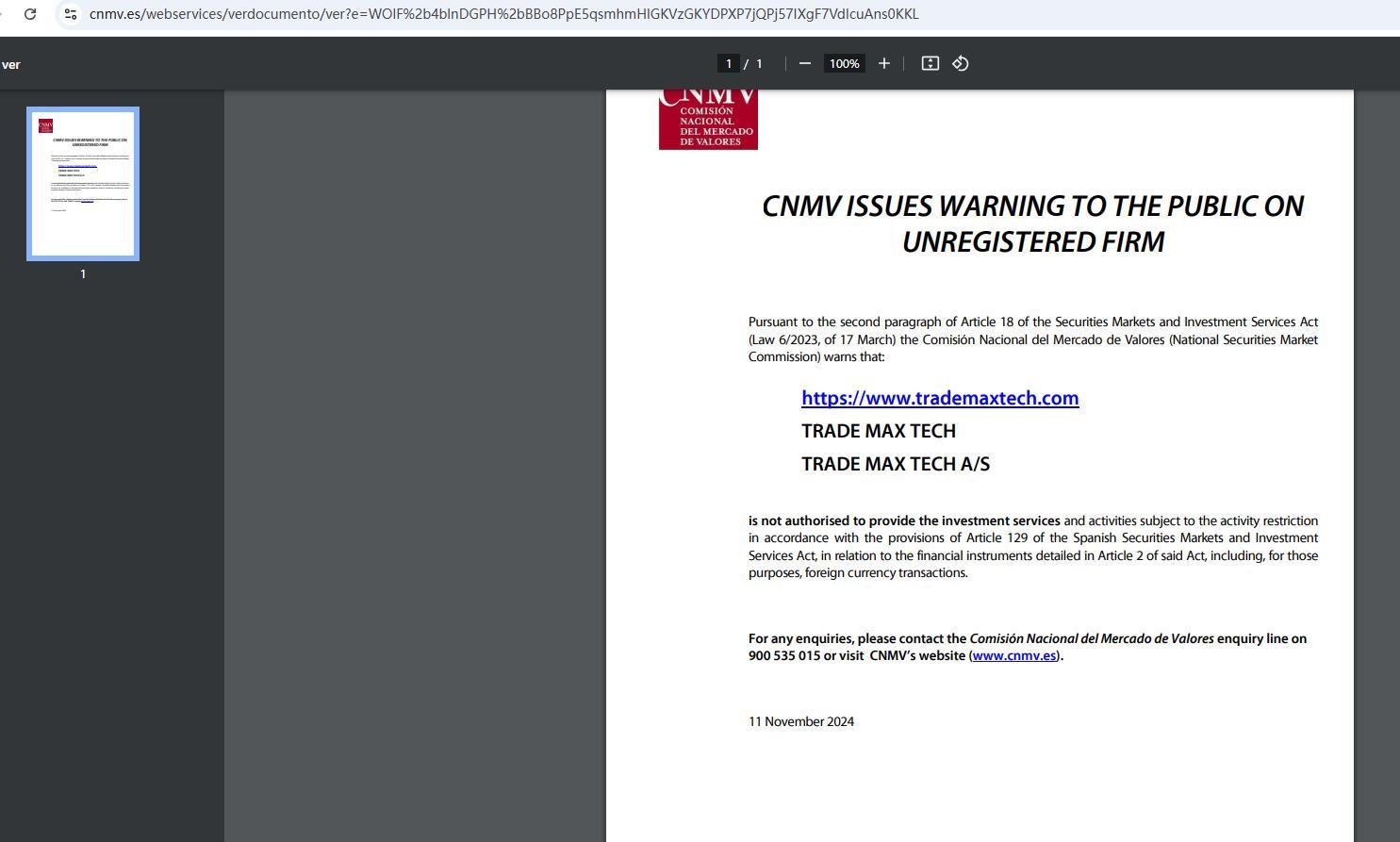 cnmv предупреждает общественность о незарегистрированной фирме в соответствии со вторым абзацем статьи 18 закона о рынках ценных бумаг и инвестиционных услугах (закон 6/2023 от 17 марта) comisión nacional del mercado de valores (национальная комиссия по рынку ценных бумаг) предупреждает, что: https://www.trademaxtech.com Trade Max Tech Trade Max Tech A/S не уполномочена предоставлять инвестиционные услуги и виды деятельности, подпадающие под ограничение деятельности в соответствии с положениями статьи 129 Закона Испании о рынках ценных бумаг и инвестиционных услугах, в отношении финансовых инструментов, указанных в статье 2 указанного Закона, включая, для этих целей, операции с иностранной валютой. По любым вопросам обращайтесь на линию по работе с клиентами Comisión nacional del Mercado de Valores по телефону 900 535 015 или посетите веб-сайт CNMV (www.cnmv.es). 11 ноября 2024 г.