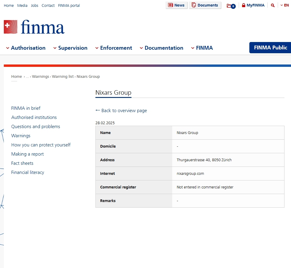 FINMA является независимым регулятором финансовых рынков Швейцарии. Его мандат заключается в надзоре за банками, страховыми компаниями, биржами, торговцами ценными бумагами, схемами коллективного инвестирования, а также за управляющими их активами и управляющими фондами компаниями. Он также регулирует деятельность дистрибьюторов и страховых посредников. Он отвечает за защиту кредиторов, инвесторов и страхователей. FINMA отвечает за обеспечение эффективного функционирования финансовых рынков Швейцарии.