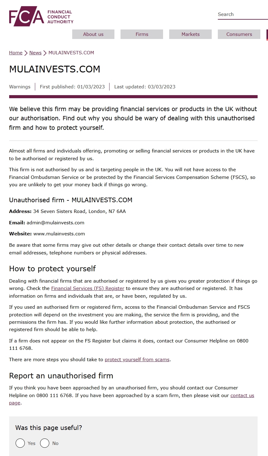 Список предупреждений FCA о неавторизованных компаниях Неавторизованная компания - MULAINVESTS.COM.