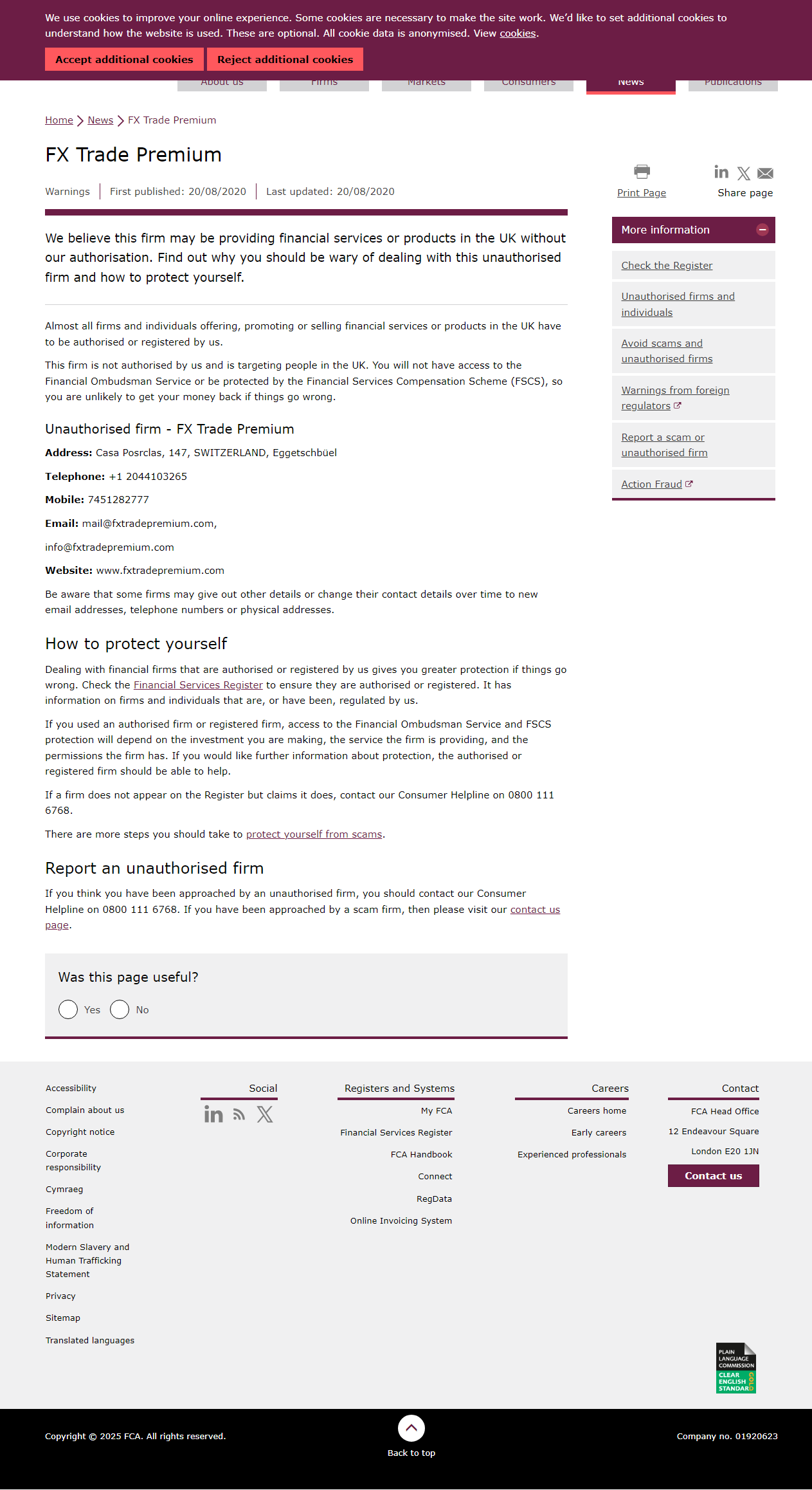 Предупреждающий список FCA о неавторизованных компаниях FX Trade Premium.