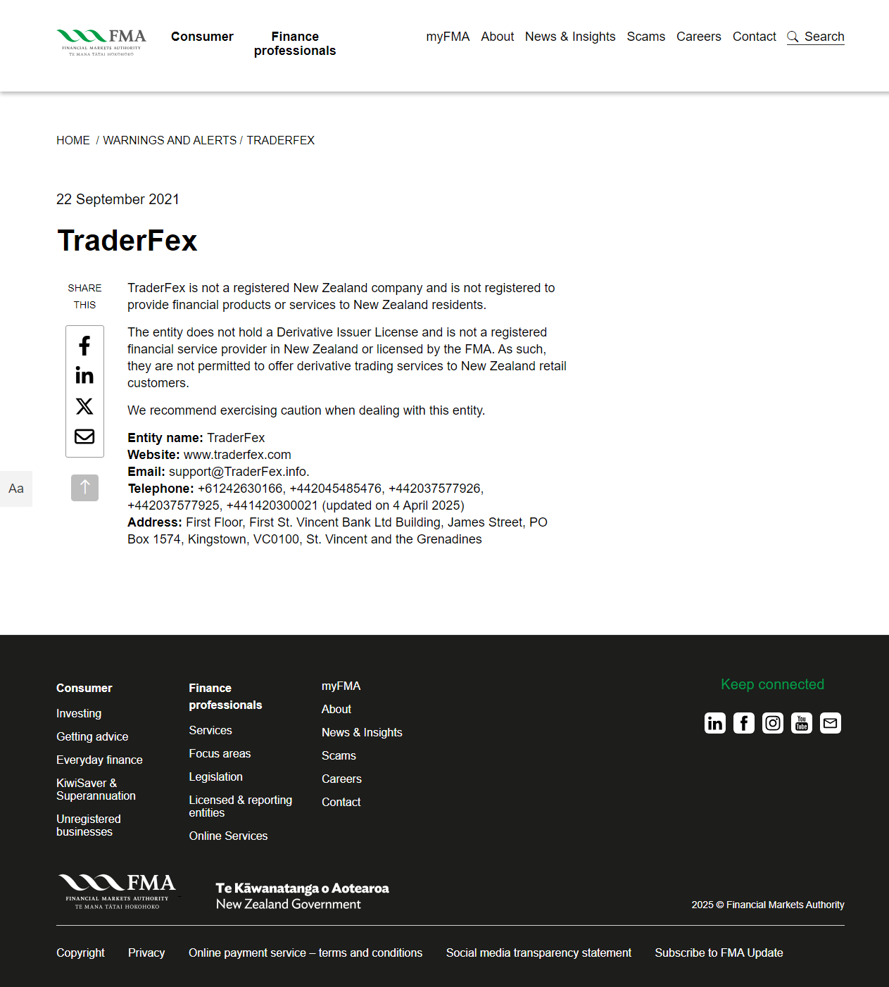 Управление по финансовым рынкам (FMA) является государственным учреждением Новой Зеландии, ответственным за обеспечение соблюдения законов о ценных бумагах, финансовой отчетности и компаниях в том, что касается финансовых услуг и рынков ценных бумаг. FMA также регулирует деятельность фондовых бирж, финансовых консультантов и брокеров, аудиторов, доверенных лиц и эмитентов, включая эмитентов KiwiSaver и пенсионных систем. Он совместно с Резервным банком Новой Зеландии (RBNZ) осуществляет надзор за целевыми расчетными системами в Новой Зеландии. FMA является членом Совета финансовых регуляторов Новой Зеландии.