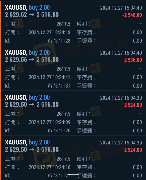 使用考試賬戶在2024/12/27+8(GMT)時間22:04止損價格設置在2617.5共有四筆訂單各2手共8手,都成交在2616.88,相差0.62,0.6的價差平台流通性差,一般情況下黃金點差固定35個點太高