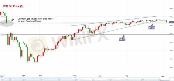 Новости WikiFX (3 сентября) - В среду цена на нефть WTI резко упала с максимума в 43,20 доллара до внутридневного минимума в 41,23 доллара, что стало самым большим однодневным падением за три месяца. Цены на нефть восстановились после небольшого падения ниже ключевой поддержки 41,30 доллара за ночь.На данный момент сохраняется консолидация выше 41,30 доллара США.