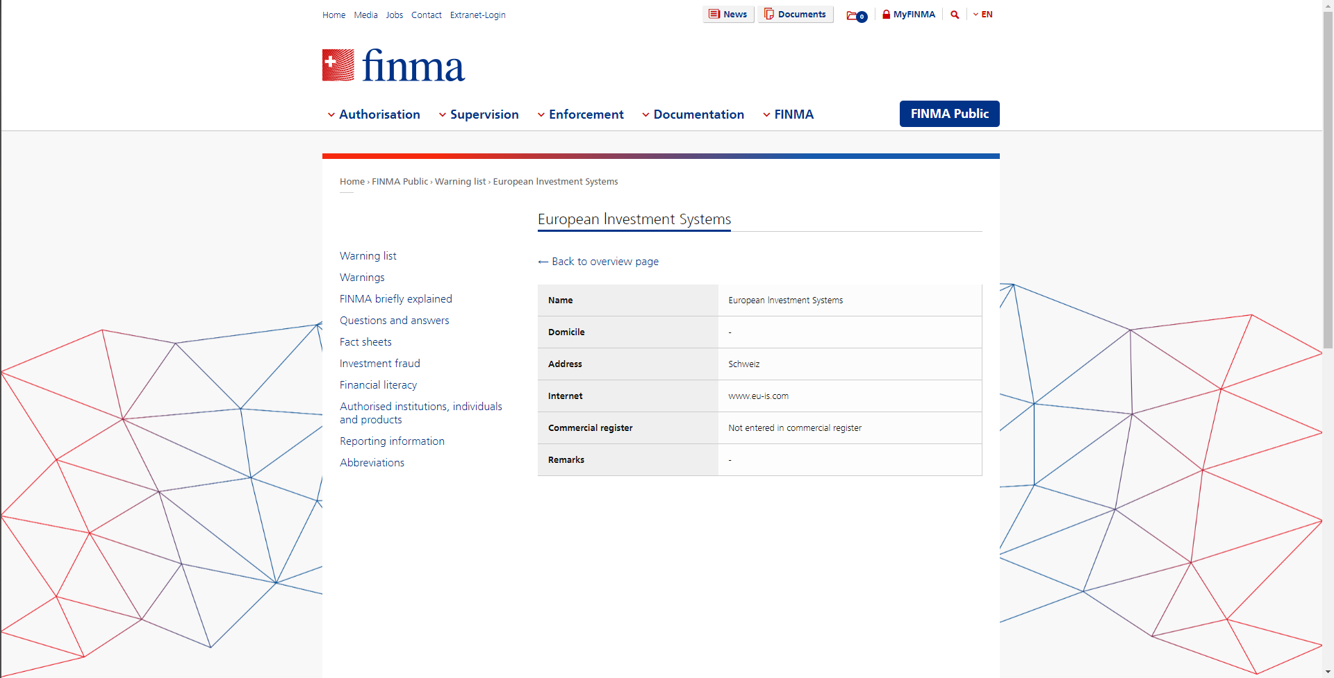 Предупредительный список несанкционированных компаний и частных лиц European Investment Systems.