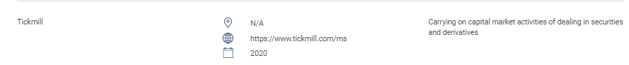 «данный раздел содержит список неавторизованных веб-сайтов, инвестиционных продуктов, компаний и частных лиц. В этот список входят: лица, осуществляющие или выдающие себя за осуществление следующих регулируемых видов деятельности без лицензии SC: операции с ценными бумагами; операции с деривативами; управление фондами, консультирование по корпоративным финансам, консультирование по инвестициям, финансовое планирование и участие в частных пенсионных схемах, лица, работающие на признанном рынке без разрешения, лица, выпускающие или предлагающие ценные бумаги без одобрения, разрешения или признания, лица, злоупотребляющие логотипом sc и представляющие ее в ложном свете. " Tickmill нет https://www. Tickmill .com/ms 2020 ведение деятельности на рынке капитала по операциям с ценными бумагами и производными финансовыми инструментами