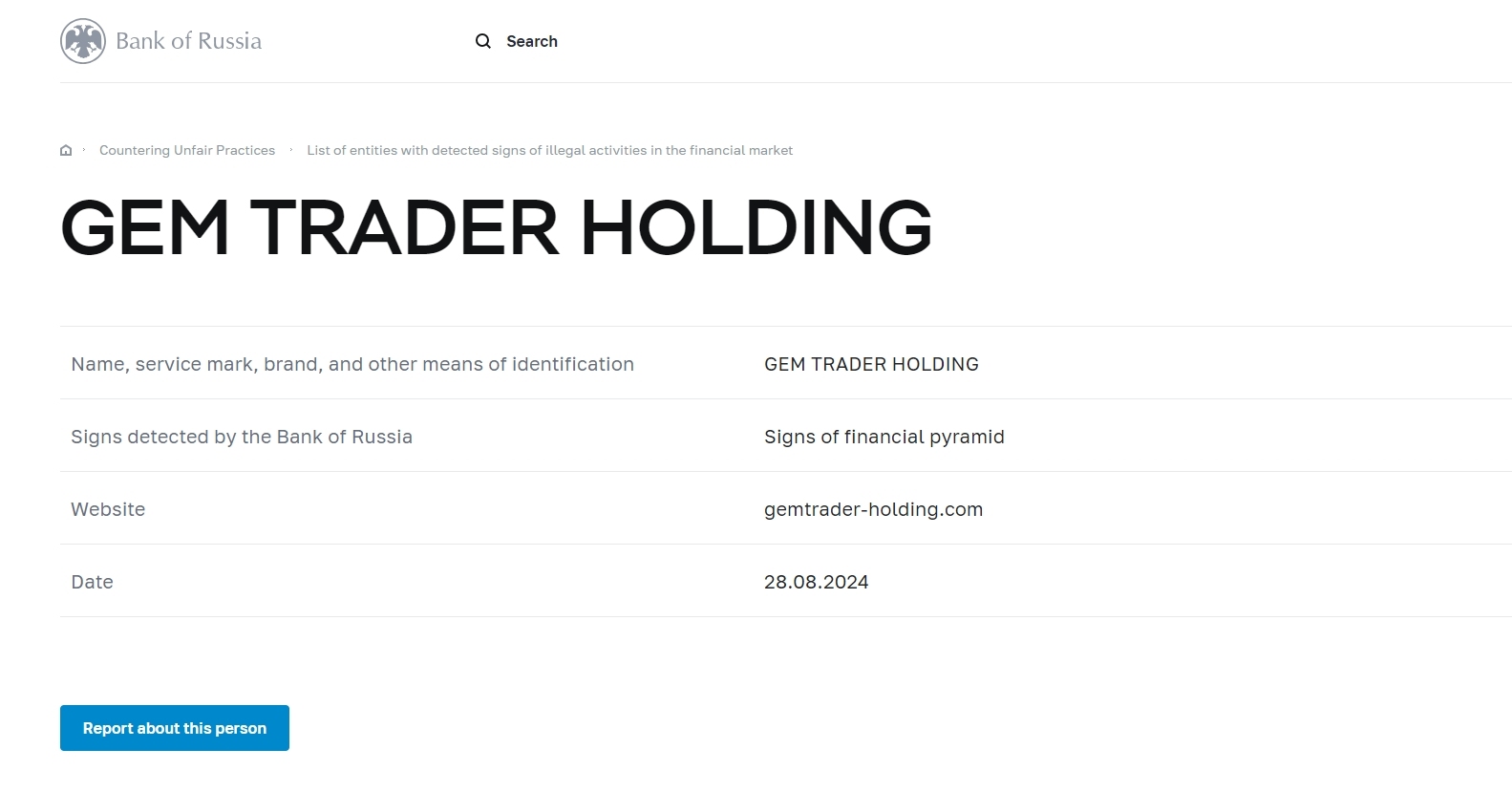 наименование, знак обслуживания, торговая марка и иные средства индивидуализации торговца драгоценными камнями, держащего в руках знаки, обнаруженные банком россии признаки сайта финансовой пирамиды Gemtrader-holding .com дата 28.08.2024
