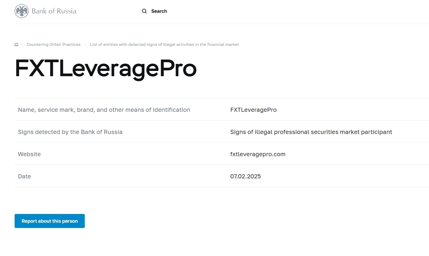 наименование, знак обслуживания, торговая марка и другие средства индивидуализации FXTLeveragePro признаки, выявленные банком россии признаки незаконного профессионального участника рынка ценных бумаг сайт FXTLeveragePro .com дата 07.02.2025