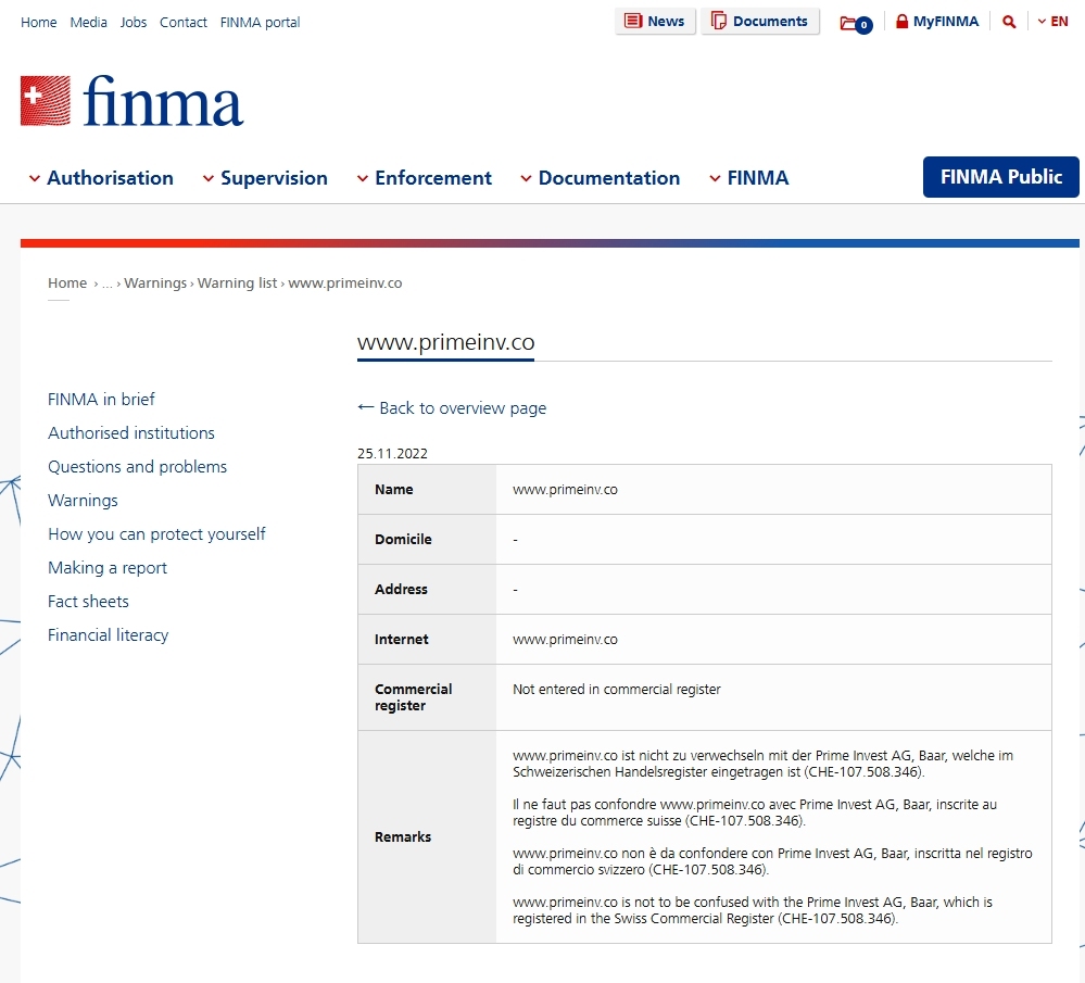 название www.primeinv.co место жительства - адрес - интернет www.primeinv.co торговый реестр не внесен в торговый реестр примечания www.primeinv.co не следует путать с Prime Invest ag, Baar, зарегистрированная в торговом реестре Швейцарии (CHE-107.508.346). Не следует путать www.primeinv.co с Prime Invest ag, baar, зарегистрированная в швейцарском торговом реестре (che-107.508.346). www.primeinv.co не следует путать с Prime Invest ag, baar, зарегистрированная в Швейцарском торговом реестре (che-107.508.346). www.primeinv.co не следует путать с Prime Invest ag, baar, зарегистрированная в швейцарском торговом реестре (che-107.508.346).
