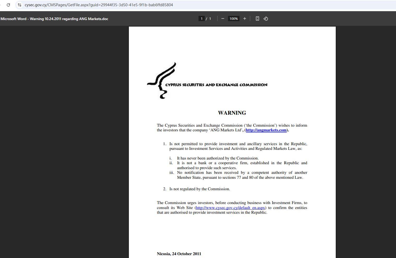 предупреждение Комиссия по ценным бумагам и биржам Кипра («комиссия») желает проинформировать инвесторов о том, что компания « ANG Markets ltd', (http://angmarkets.com). 1. не имеет права предоставлять инвестиционные и вспомогательные услуги в республике в соответствии с инвестиционными услугами и деятельностью и законом о регулируемых рынках, поскольку: i. никогда не была уполномочена комиссией. ii. не является банком или кооперативной фирмой, созданной в республике и уполномоченной предоставлять такие услуги. iii. не было получено уведомления от компетентного органа другого государства-члена в соответствии с разделами 77 и 80 вышеупомянутого закона. 2. не регулируется комиссией. комиссия настоятельно рекомендует инвесторам, прежде чем вести дела с инвестиционными фирмами, ознакомиться с ее веб-сайтом (http://www.cysec.gov.cy/default_en.aspx), чтобы подтвердить наличие организаций, уполномоченных предоставлять инвестиционные услуги в республике. никосия, 24 октября 2011 г.