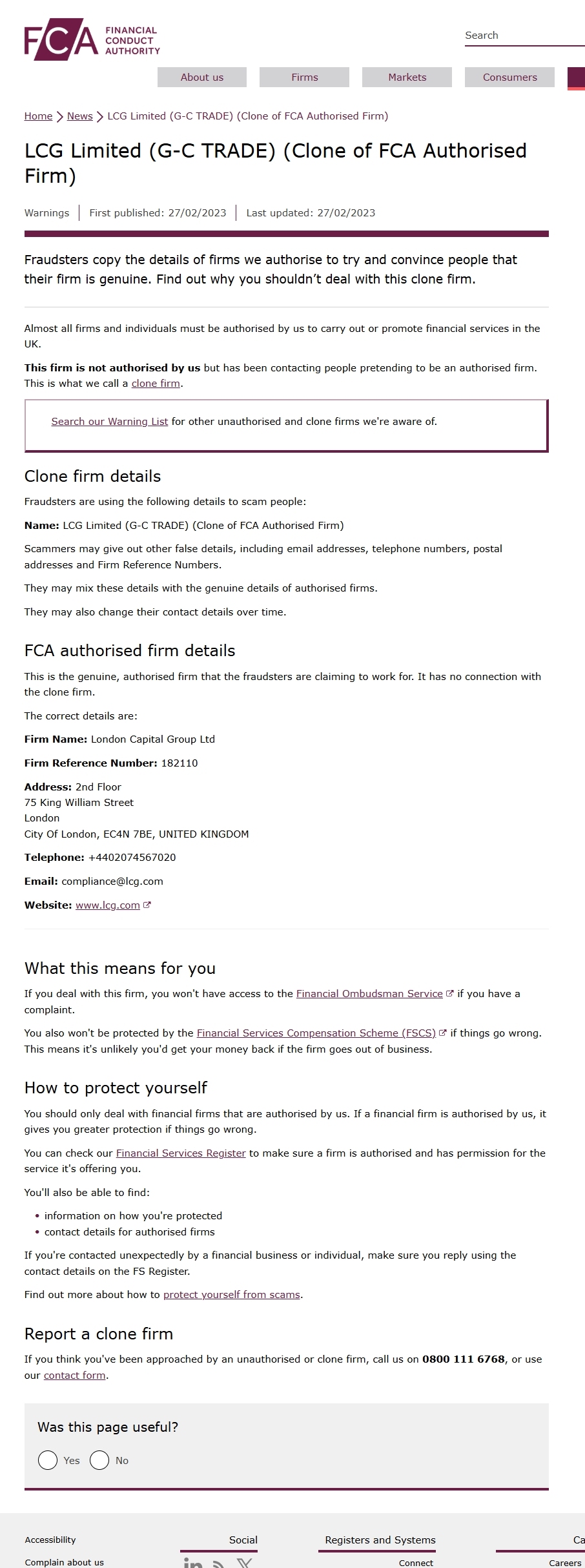 Предупреждающий список FCA о неавторизованных компаниях LCG Limited (G-C TRADE) (Клон авторизованной FCA фирмы).