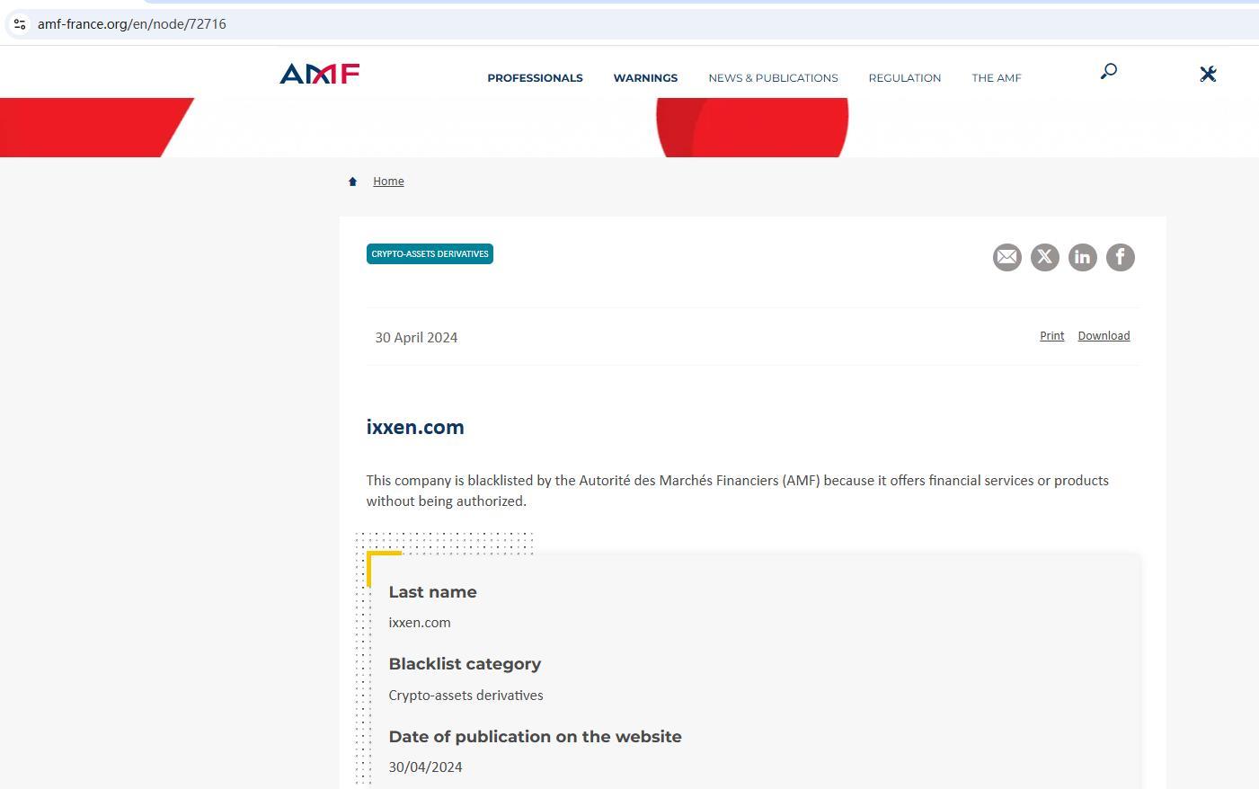 Ixxen.com эта компания занесена в черный список Управлением по финансовым рынкам (amf), поскольку она предлагает финансовые услуги или продукты без разрешения. фамилия Ixxen .com черный список категория криптоактивы деривативы дата публикации на сайте 30/04/2024