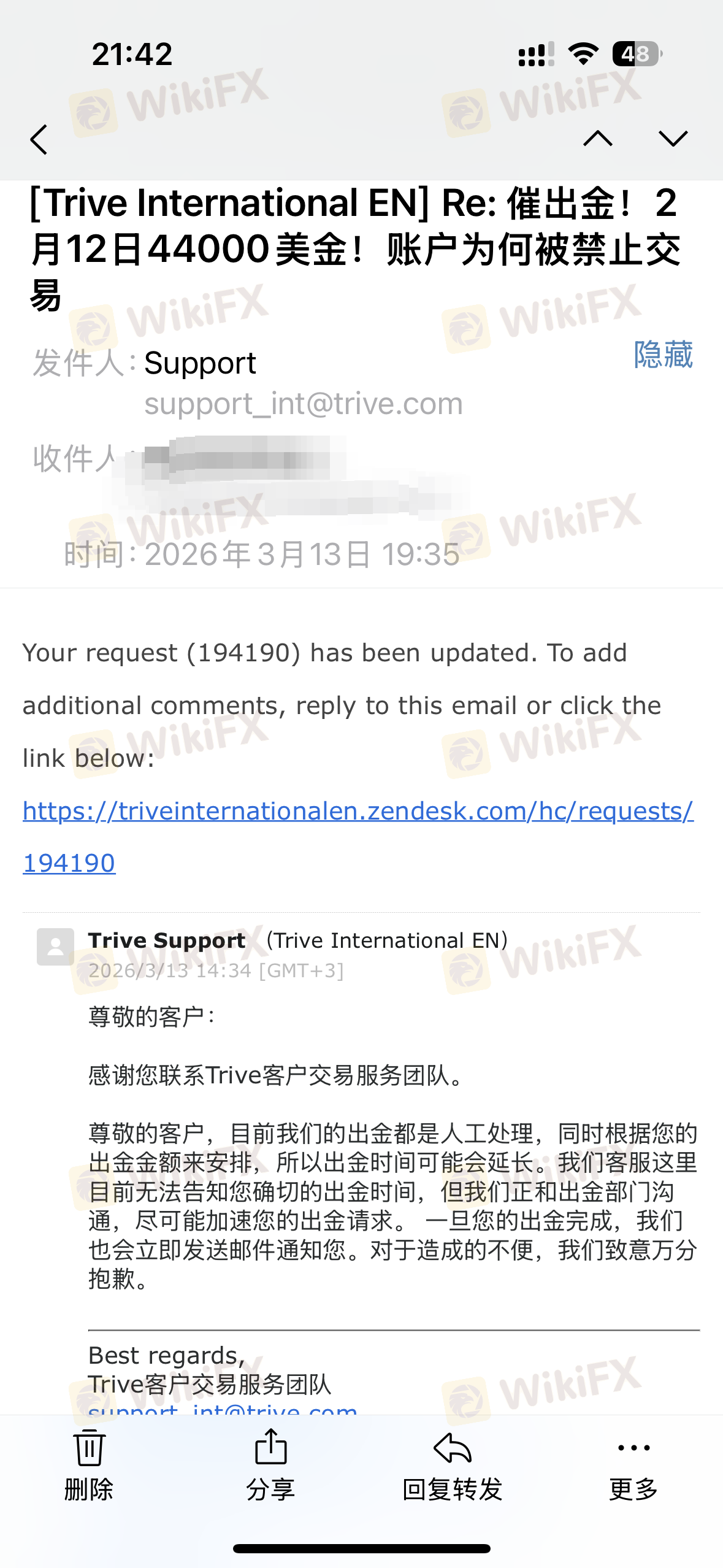 ตลอด 7-8 ปีที่ผ่านมานี้ ผมได้เทเงินเก็บทั้งหมดที่หามาได้อย่างยากลำบากลงไปในการเทรด ด้วยผลลัพธ์ที่ย่อยยับจนเจ็บปวดเกินกว่าจะบรรยาย เริ่มตั้งแต่ปี 2025 ผมมีทำกำไรได้บ้างเป็นครั้งคราวจากการเทรดระยะสั้น และการฝาก/ถอนเงินก็ดำเนินไปตามปกติ ก่อนเทศกาลตรุษจีนปี 2026 เล็กน้อย ตามการคาดการณ์ช่วงตลาดและกลยุทธ์การเทรดของผม การเทรดด้วยตนเองเกือบทั้งหมดของผมเป็นไปอย่างถูกต้อง ส่งผลให้มีกำไรที่มากและสม่ำเสมอ ปัญหาที่เกิดขึ้น: 1. การถอนเงินถูกบล็อก: วันที่ 12 กุมภาพันธ์ 2026 ผมได้ยื่นคำขอถอนเงินจำนวน 44,000 ดอลลาร์สหรัฐ เว็บไซต์ทางการ/อีเมลยืนยันว่าเงินจะเข้าภายใน 2 วันทำการ ตอนนี้ผ่านมาแล้วครบ 31 วัน ผมยังไม่ได้รับเงินแม้แต่เซ็นเดียว บริการลูกค้าบอกซ้ำแล้วซ้ำเล่าว่า "ไม่สามารถระบุไทม์ไลน์ที่แน่นอนสำหรับการถอนเงินได้" โดยไม่เสนอทางออกใดๆ 2. การบังคับปิดสถานะและแบนบัญชี: วันที่ 13 กุมภาพันธ์ 2026 แพลตฟอร์มได้บังคับปิดสถานะการถือครองระยะยาวที่ผมวางตำแหน่งไว้อย่างรอบคอบโดยไม่มีเหตุผลอันควร บัญชีของผมยังถูกแบนไม่ให้ทำการเทรดใดๆ ต่อไป 3. กักเงินไว้เป็นตัวประกัน: ยอดเงินในบัญชีของผมปัจจุบันอยู่ที่ 152,541.05 ดอลลาร์สหรัฐ เนื่องจากคุณได้แบนบัญชีของผมจากการเทรดแล้ว คุณมีหน้าที่ต้องคืนยอดเงินทั้งหมดให้ผมทันที ข้อเรียกร้องของผม: หาก Trive ดำเนินการเป็นโบรกเกอร์แบบ STP ที่รับค่าคอมมิชชัน ก็ไม่มีสิทธิ์เข้ามาแทรกแซงหรือแบนบัญชีลูกค้า หากทำตัวเป็นคู่สัญญาในโมเดล B-Book ก็ต้องจ่ายกำไรให้ลูกค้า เป็นสิ่งที่ไร้ยางอายและผิดจรรยาบรรณอย่างยิ่งที่แพลตฟอร์มจะปล่อยให้ลูกค้าขาดทุนจนหมดตัว แต่กลับมาห้ามและยึดกำไรที่ลูกค้าหามาได้อย่างยากลำบาก ลูกค้าเสี่ยงกับเงินเก็บทั้งชีวิตในตลาดเหล่านี้ พฤติกรรมเช่นนี้ไม่มีขีดจำกัดด้านจริยธรรม หากคุณรับมือกับผู้ชนะไม่ได้ ก็จงเลิกทำธุรกิจและหยุดหลอกลวงเทรดเดอร์ ผมต้องการคำตอบโดยตรงจาก Trive: คุณจะดำเนินการถอนเงินและคืนยอดเงินเต็มจำนวน 152,541.05 ดอลลาร์สหรัฐในบัญชีของผมให้ผมเมื่อไร? ผมเรียกร้องให้ผู้บริหารระดับสูงติดต่อผมโดยตรง อย่าหลบซ่อน จงให้คำตอบที่ชัดเจนและแน่นอนกับผมตอนนี้