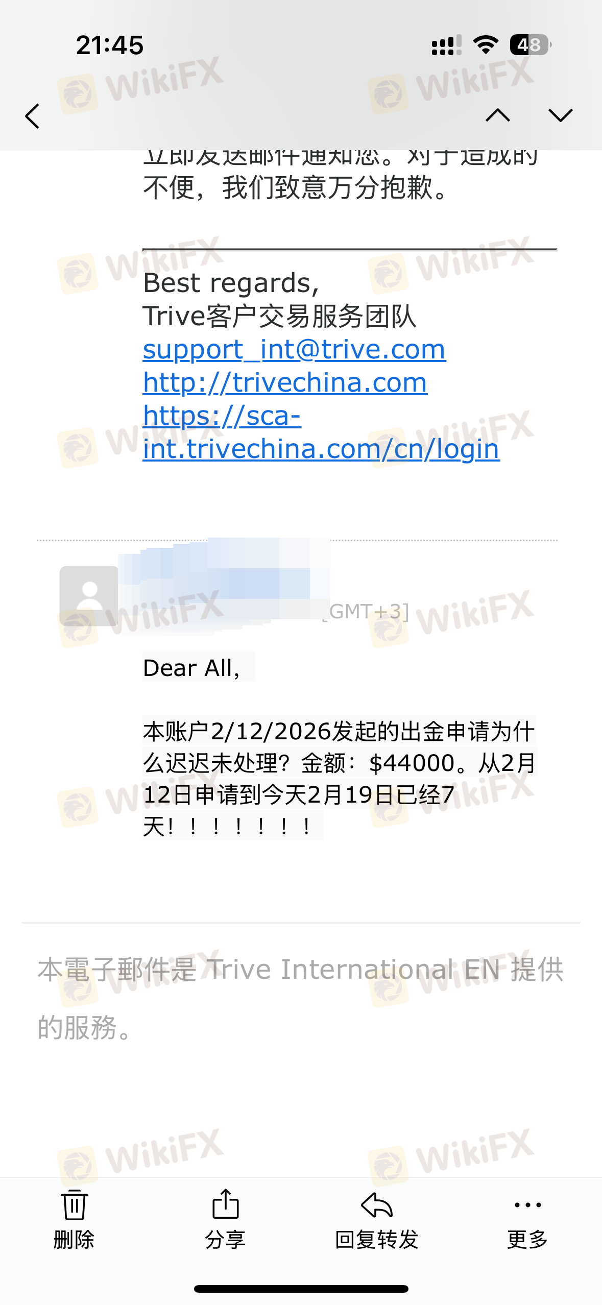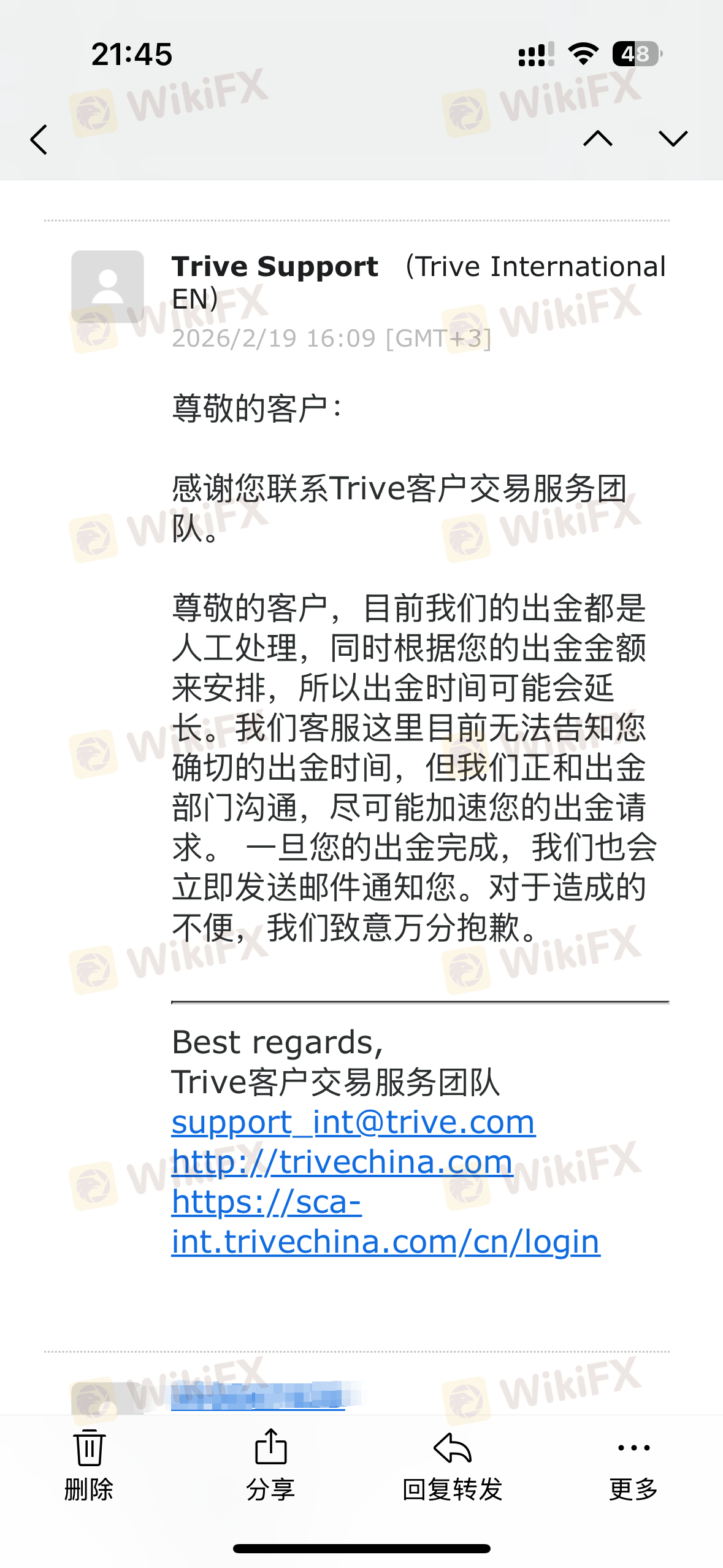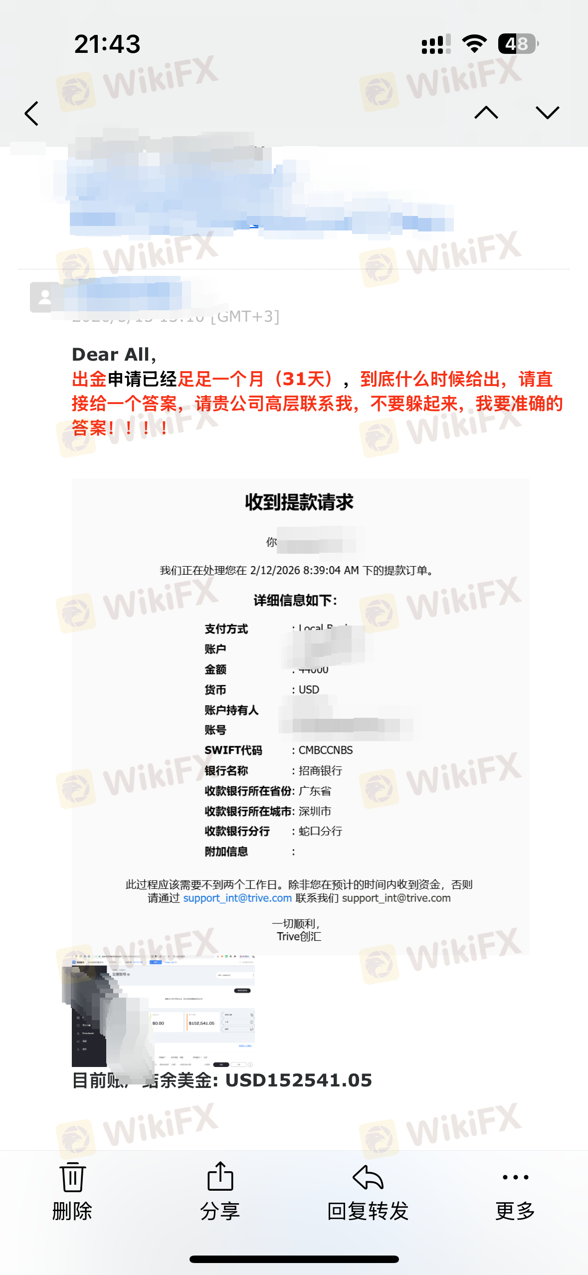 ในวันที่ 28 กันยายน TRIVE โอนเงินทั้งหมดในบัญชีของฉันจำนวน 2155 ดอลลาร์โดยไม่มีเหตุผลใด ๆ บัญชีตัวแทนของฉันก็ถูกโอนเงินจำนวน 373 ดอลลาร์เช่นกัน ตอนนี้ทั้งบัญชีเงินทุนและบัญชีตัวแทนของฉันมียอดเงินคงเหลือเป็น 0 ไม่มีการแจ้งเตือนใด ๆ ฉันไม่รู้ว่าพวกเขาหนีไปหรือเปล่า? ฉันต้องการให้ TRIVE คืนเงินทั้งหมดของฉัน ให้คำอธิบาย และขอโทษ! หมายเลขติดต่อ: 18937190669, อีเมล: 18937190669@189.CN
