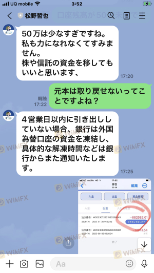 เมื่อวันที่ 6 พฤษภาคม ฉันถอนเงิน 2.07 ล้าน รวมทั้งเงินต้น 1.03 ล้าน จากบริษัทนี้ แต่บริษัทไม่ได้บอกฉันว่าฉันต้องเสียภาษีต่างประเทศ เมื่อวันที่ 7 กรกฎาคม ฉันได้ฝากเงินครั้งที่สองเป็นจำนวน 2 ล้านครั้ง คุณมัตสึโนะกล่าวว่า "เงินดาวน์ 2 ล้านก็ใช้ได้ ฉันจะให้คุณยืม 5 ล้านโดยไม่มีดอกเบี้ย ตอนนั้นฉันไม่ต้องการยืม 5 ล้าน ฉันแค่ต้องการทำกำไรเล็กน้อยด้วยเงินต้นของ 2 ล้าน." คุณมัตสึโนะยุให้ผมยืมโดยไม่คิดดอกเบี้ยซ้ำแล้วซ้ำเล่า และหลังจากลังเลอยู่พักหนึ่ง ผมก็ตกลง ได้คืน 5 ล้านใน 3 วัน หลังจากนั้นคุณทานากะและคุณมัตสึโนะก็แนะนำฉันทุกวัน ผ่านไปครึ่งเดือน ผมทำเงินได้ 90 กว่าล้าน จากเงินต้น 7 ล้าน นี่คือสิ่งที่หลายคนในกลุ่มพูดว่า “อยากถอนเงิน” ผมก็เลยอยากถอนด้วย เลี่ยงภาษีกลายเป็นว่าก่อนหน้านี้ไม่ได้จ่ายภาษี 1 ล้าน เลยบอกว่าถอนไม่ได้และก่อนจะถอนเงินได้ต้องจ่ายภาษี 17 ล้านทีเดียว