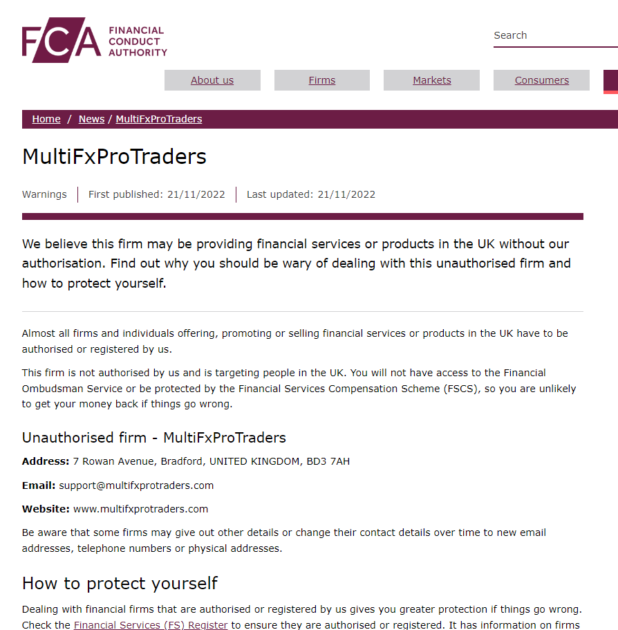 รายชื่อเตือนจาก FCA ของบริษัทที่ไม่มีสิทธิ์ MultiFxProTraders.