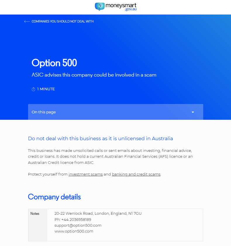 รายการแจ้งเตือนนักลงทุน ตัวเลือก 500 ASIC แจ้งว่าบริษัทนี้อาจเกี่ยวข้องกับการฉ้อโกง.