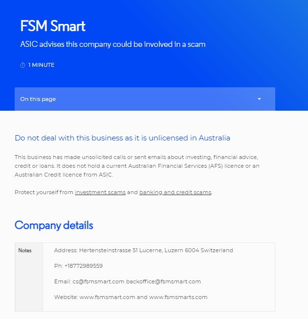 รายการแจ้งเตือนนักลงทุน FSM Smart ASIC แจ้งว่าบริษัทนี้อาจเกี่ยวข้องกับการฉ้อโกง.