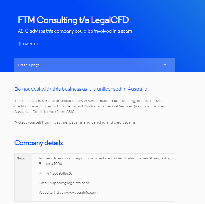 รายการแจ้งเตือนนักลงทุน FTM Consulting t/a LegalCFD ASIC แจ้งว่าบริษัทนี้อาจเกี่ยวข้องกับการฉ้อโกง.