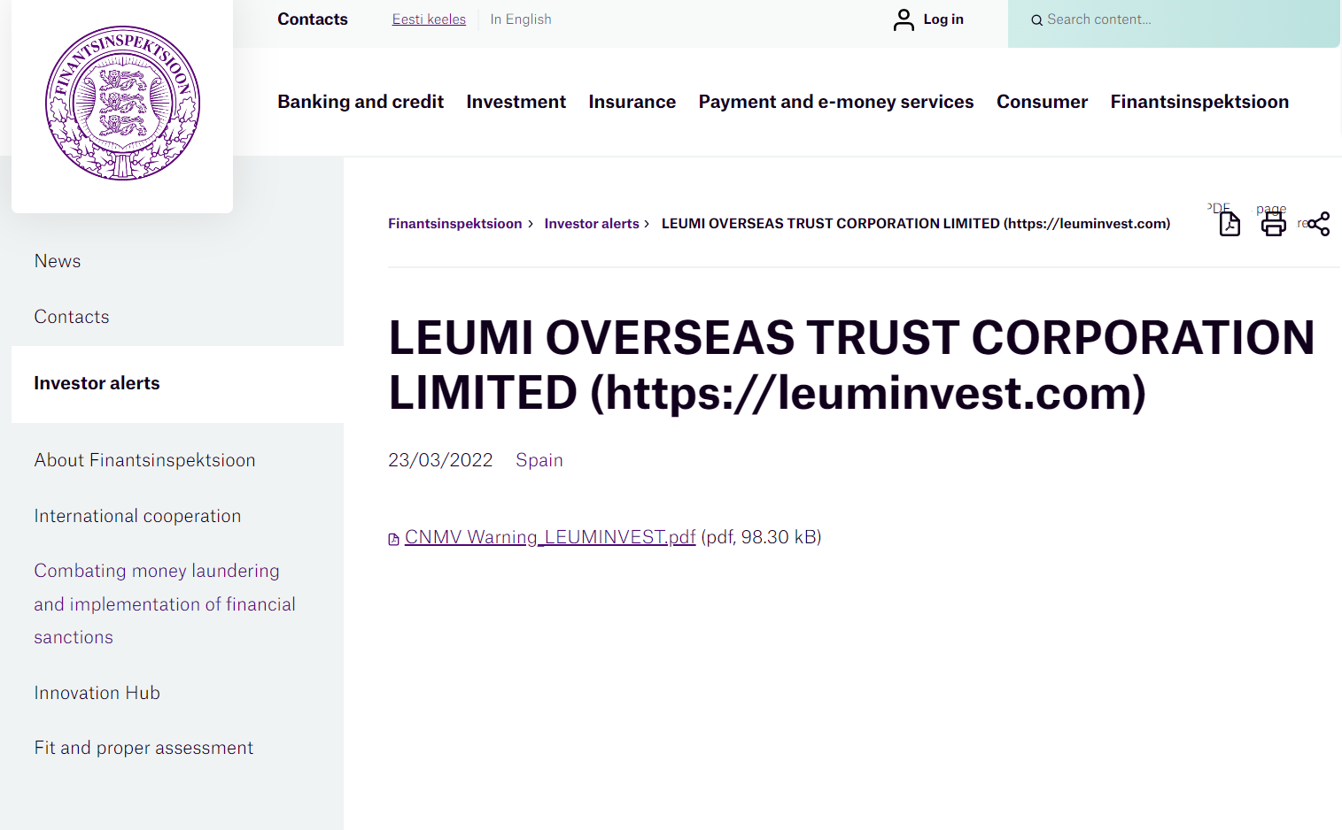 LEUMI OVERSEAS TRUST CORPORATION LIMITED(https:// Leuminvest .com) 23/03/2022 สเปน cnmv ออกคำเตือนต่อสาธารณะเกี่ยวกับบริษัทที่ไม่ได้จดทะเบียนตามวรรคสองของมาตรา 17 ของกฎหมายตลาดหลักทรัพย์ (ข้อความดัดแปลงที่ได้รับอนุมัติโดยพระราชกฤษฎีกาสภานิติบัญญัติ 4/2015 วันที่ 23 ตุลาคม) comisión nacional del mercado de valores (คณะกรรมการตลาดหลักทรัพย์แห่งชาติ) เตือนว่า: LEUMI OVERSEAS TRUST CORPORATION LIMITED ไม่ได้รับอนุญาตให้ให้บริการด้านการลงทุนที่กำหนดไว้ในมาตรา 140 ของพระราชบัญญัติตลาดหลักทรัพย์สเปน ซึ่งรวมถึงคำแนะนำด้านการลงทุน หรือให้บริการเสริมตามรายละเอียดในมาตรา 141(a), (b), (d), (f) และ (ช) การกระทำดังกล่าวเกี่ยวกับเครื่องมือทางการเงินที่ระบุไว้ในมาตรา 2 ของการกระทำดังกล่าว รวมถึงการทำธุรกรรมเงินตราต่างประเทศเพื่อวัตถุประสงค์ดังกล่าว หากมีข้อสงสัยใดๆ โปรดติดต่อสายสอบถามcomisión nacional del mercado de valores ที่หมายเลข 900 535 015 หรือเยี่ยมชมเว็บไซต์ของ cnmv (www.cnmv.es) 21 มีนาคม 2022.