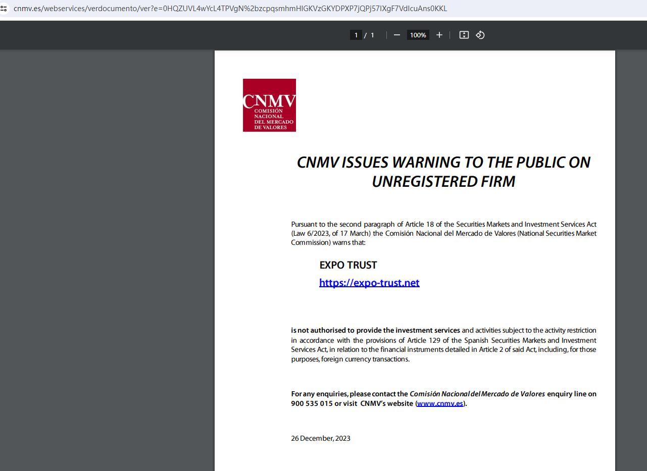 cnmv ออกคำเตือนแก่สาธารณชนเกี่ยวกับบริษัทที่ไม่ได้จดทะเบียนตามวรรคสองของมาตรา 18 ของพระราชบัญญัติตลาดหลักทรัพย์และบริการด้านการลงทุน (กฎหมาย 6/2023 ลงวันที่ 17 มีนาคม) comisión nacional del mercado de valores (คณะกรรมการตลาดหลักทรัพย์แห่งชาติ) เตือนว่า : : Expo Trust https://expo-trust.net ไม่ได้รับอนุญาตให้ให้บริการด้านการลงทุนและกิจกรรมภายใต้ข้อจำกัดของกิจกรรมตามบทบัญญัติของมาตรา 129 ของพระราชบัญญัติตลาดหลักทรัพย์และการบริการด้านการลงทุนของสเปน ที่เกี่ยวข้องกับเครื่องมือทางการเงินที่มีรายละเอียดใน มาตรา 2 ของการกระทำดังกล่าว รวมถึงการทำธุรกรรมเงินตราต่างประเทศเพื่อวัตถุประสงค์ดังกล่าว หากมีข้อสงสัยใดๆ โปรดติดต่อสายสอบถามcomisión nacional del mercado de valores ที่หมายเลข 900 535 015 หรือเยี่ยมชมเว็บไซต์ของ cnmv (www.cnmv.es) 26 ธันวาคม 2566