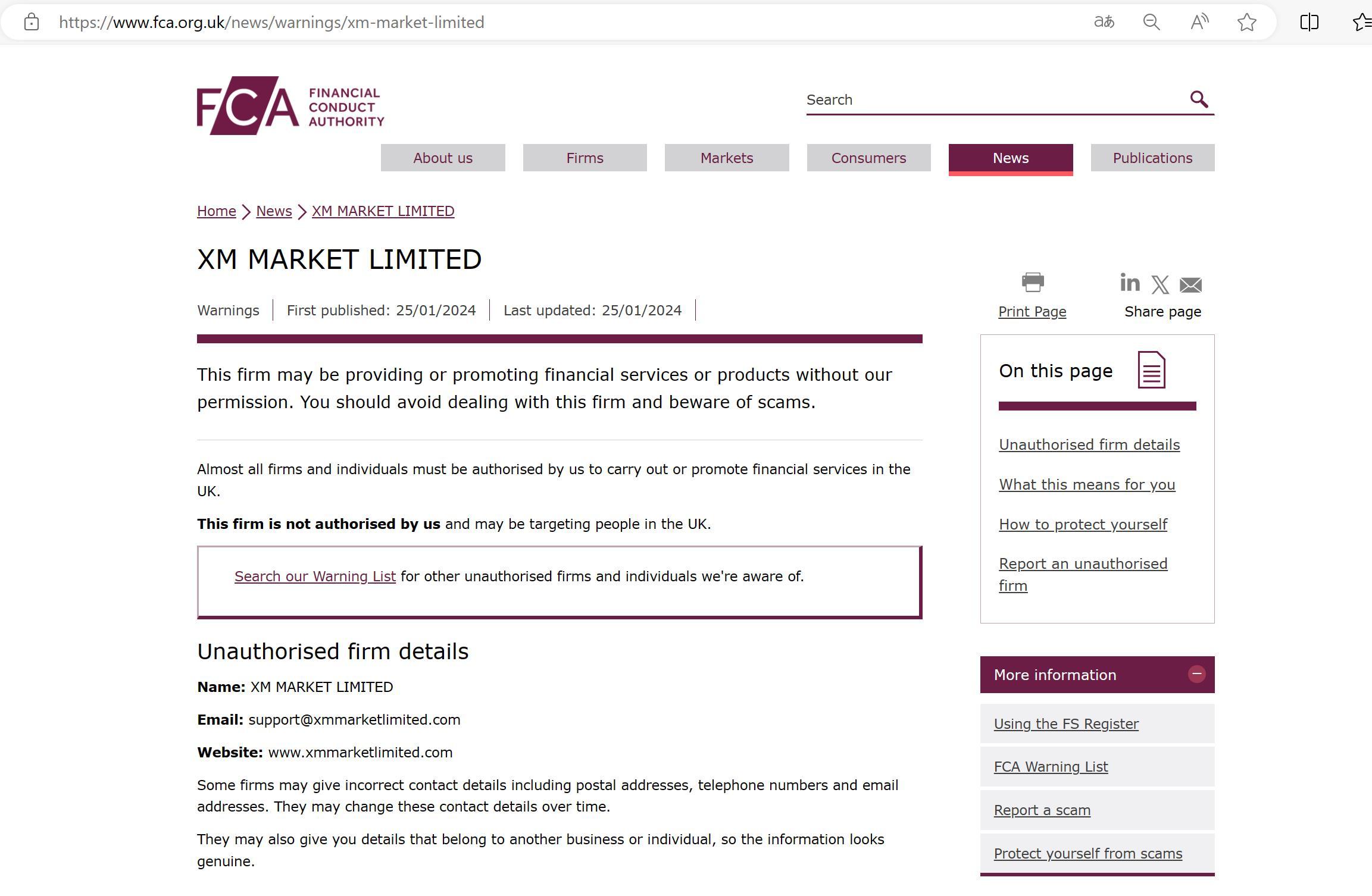 รายชื่อเตือนจาก FCA ของบริษัทที่ไม่มีสิทธิ์ XM MARKET LIMITED.