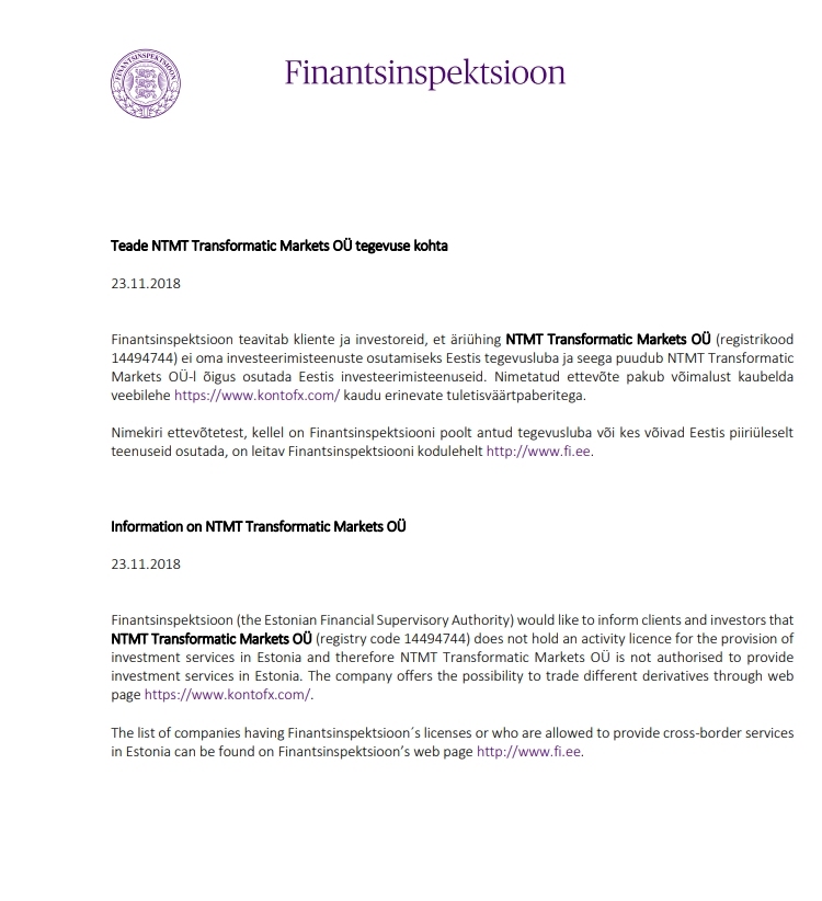 ประกาศเกี่ยวกับกิจกรรมของ NTMT Transformatic Markets OÜ 23.11.2018 หน่วยงานกำกับดูแลทางการเงินแจ้งให้ลูกค้าและนักลงทุนทราบว่าบริษัท NTMT Transformatic Markets OÜ (รหัสลงทะเบียน 14494744) ไม่มีใบอนุญาตดำเนินการสำหรับการให้บริการด้านการลงทุนในเอสโตเนีย ดังนั้น NTMT Transformatic Markets OÜ ไม่มีสิทธิ์ให้บริการด้านการลงทุนในเอสโตเนีย บริษัทดังกล่าวเสนอโอกาสในการซื้อขายอนุพันธ์ต่างๆ ผ่านทางเว็บไซต์ https://www.kontofx.com/ รายชื่อบริษัทที่มีใบอนุญาตประกอบการที่ออกโดย Financial Supervision Authority หรือที่สามารถให้บริการข้ามพรมแดนในเอสโตเนียได้บนเว็บไซต์ของ Financial Supervision Authority ที่ http://www.fi.ee ข้อมูลเกี่ยวกับ NTMT Transformatic Markets OÜ 23.11.2018 Finantsinspektsioon (หน่วยงานกำกับดูแลทางการเงินของเอสโตเนีย) ต้องการแจ้งให้ลูกค้าและนักลงทุนทราบว่า NTMT Transformatic Markets OÜ (รหัสทะเบียน 14494744) ไม่มีใบอนุญาตกิจกรรมสำหรับการให้บริการด้านการลงทุนในเอสโตเนีย ดังนั้น NTMT Transformatic Markets OÜ ไม่ได้รับอนุญาตให้ให้บริการด้านการลงทุนในเอสโตเนีย บริษัทเสนอความเป็นไปได้ในการซื้อขายอนุพันธ์ต่างๆ ผ่านทางหน้าเว็บ https://www.kontofx.com/ รายชื่อบริษัทที่มีใบอนุญาตของ Finantsinspektsioon หรือผู้ที่ได้รับอนุญาตให้ให้บริการข้ามพรมแดนในเอสโตเนีย สามารถดูได้ที่หน้าเว็บของ Finantsinspektsioon ที่ http://www.fi.ee