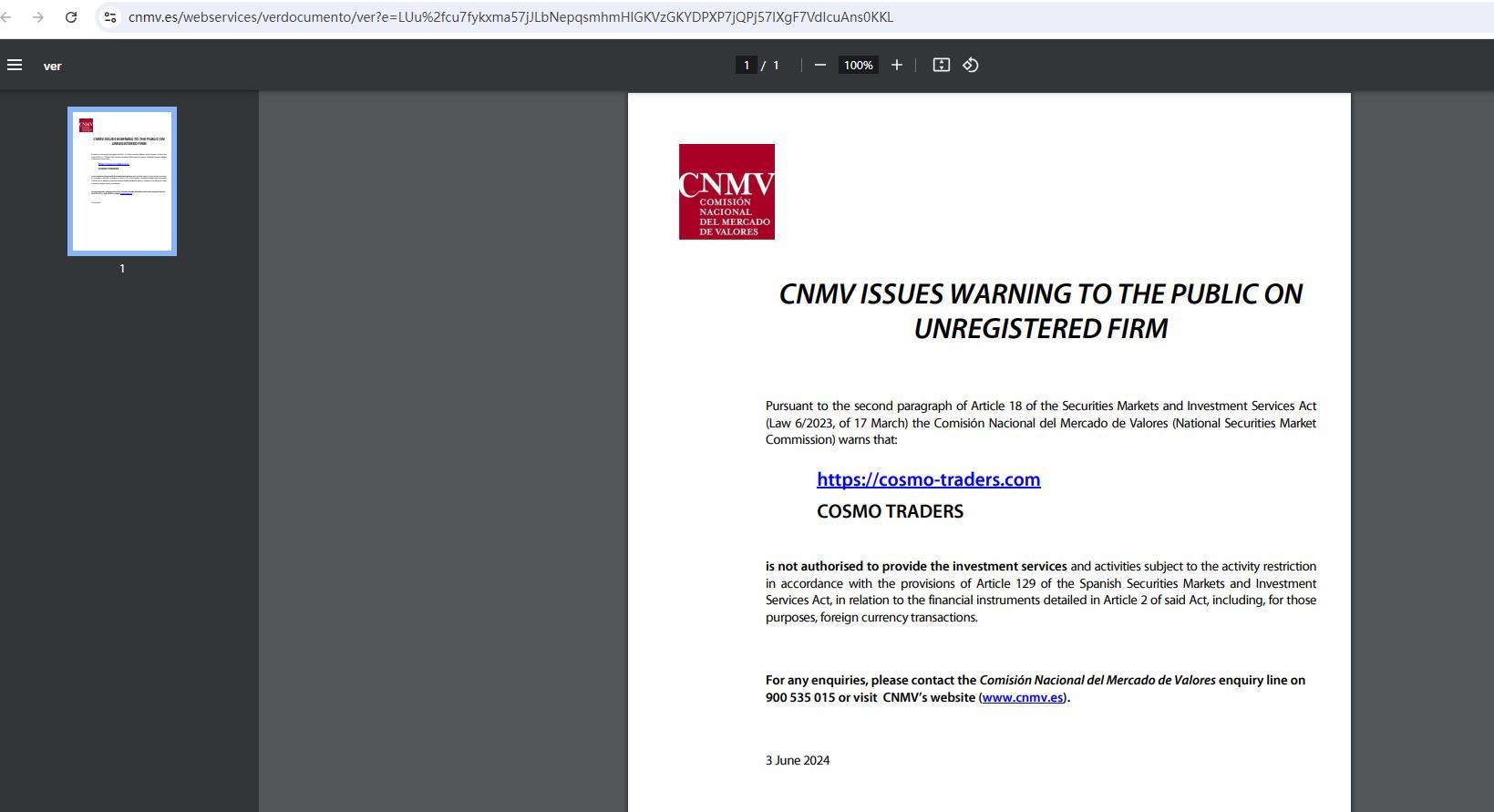 cnmv ออกคำเตือนต่อสาธารณชนเกี่ยวกับบริษัทที่ไม่ได้จดทะเบียนตามวรรคสองของมาตรา 18 ของพระราชบัญญัติตลาดหลักทรัพย์และบริการการลงทุน (กฎหมาย 6/2023, ลงวันที่ 17 มีนาคม) คณะกรรมการตลาดหลักทรัพย์แห่งชาติ (comisión nacional del mercado de valores) เตือนว่า: https:// Cosmo-Traders .com cosmo traders ไม่มีอำนาจให้บริการการลงทุนและกิจกรรมที่อยู่ภายใต้ข้อจำกัดของกิจกรรมตามบทบัญญัติของมาตรา 129 ของกฎหมายตลาดหลักทรัพย์และบริการการลงทุนของสเปน ในส่วนที่เกี่ยวข้องกับตราสารทางการเงินที่มีรายละเอียดในมาตรา 2 ของกฎหมายดังกล่าว ซึ่งรวมถึงธุรกรรมสกุลเงินต่างประเทศเพื่อวัตถุประสงค์ดังกล่าว หากมีคำถามใดๆ โปรดติดต่อสายสอบถาม comisión nacional del mercado de valores ที่หมายเลข 900 535 015 หรือเยี่ยมชมเว็บไซต์ของ cnmv (www.cnmv.es) 3 มิถุนายน 2024