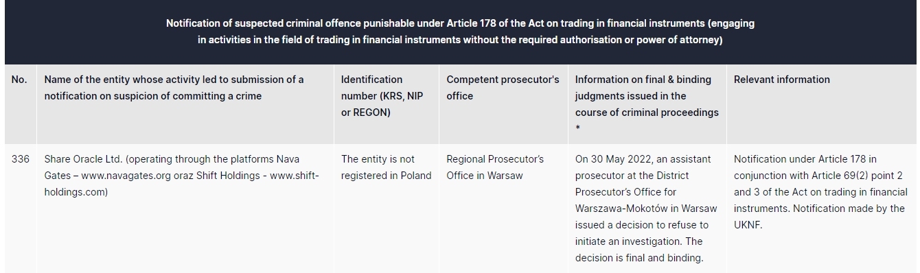 Share Oracle Ltd.(ดำเนินการผ่านแพลตฟอร์ม Nava Gates – www.navagates.org oraz shift holdings - www.shift-holdings.com) นิติบุคคลไม่ได้จดทะเบียนในสำนักงานอัยการประจำภูมิภาคโปแลนด์ในวอร์ซอ เมื่อวันที่ 30 พฤษภาคม 2022 อัยการผู้ช่วยของสำนักงานอัยการเขตวอร์ซอ-โมโคโตฟในวอร์ซอได้ออกคำตัดสินปฏิเสธการเริ่มการสอบสวน คำตัดสินถือเป็นที่สิ้นสุดและผูกพัน การแจ้งเตือนภายใต้มาตรา 178 ร่วมกับมาตรา 69(2) ข้อ 2 และ 3 ของพระราชบัญญัติว่าด้วยการซื้อขายตราสารทางการเงิน การแจ้งเตือนทำโดย UKNF