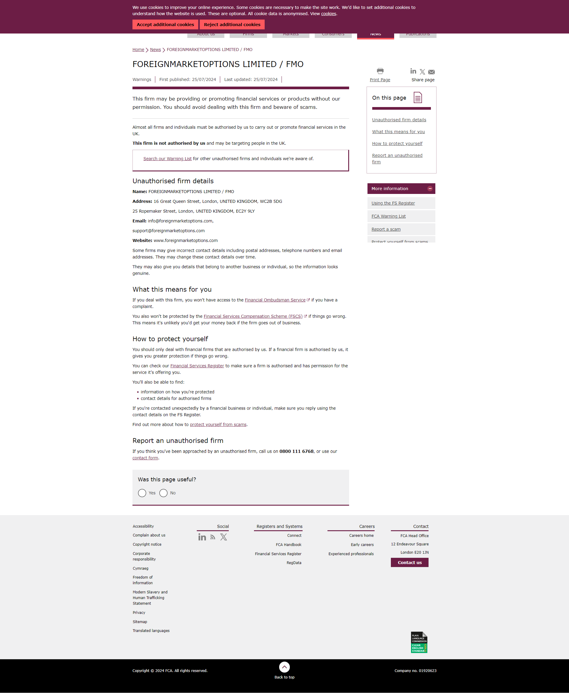 รายชื่อคำเตือนของ FCA เกี่ยวกับบริษัทที่ไม่มีอนุญาต FOREIGNMARKETOPTIONS LIMITED / FMO.