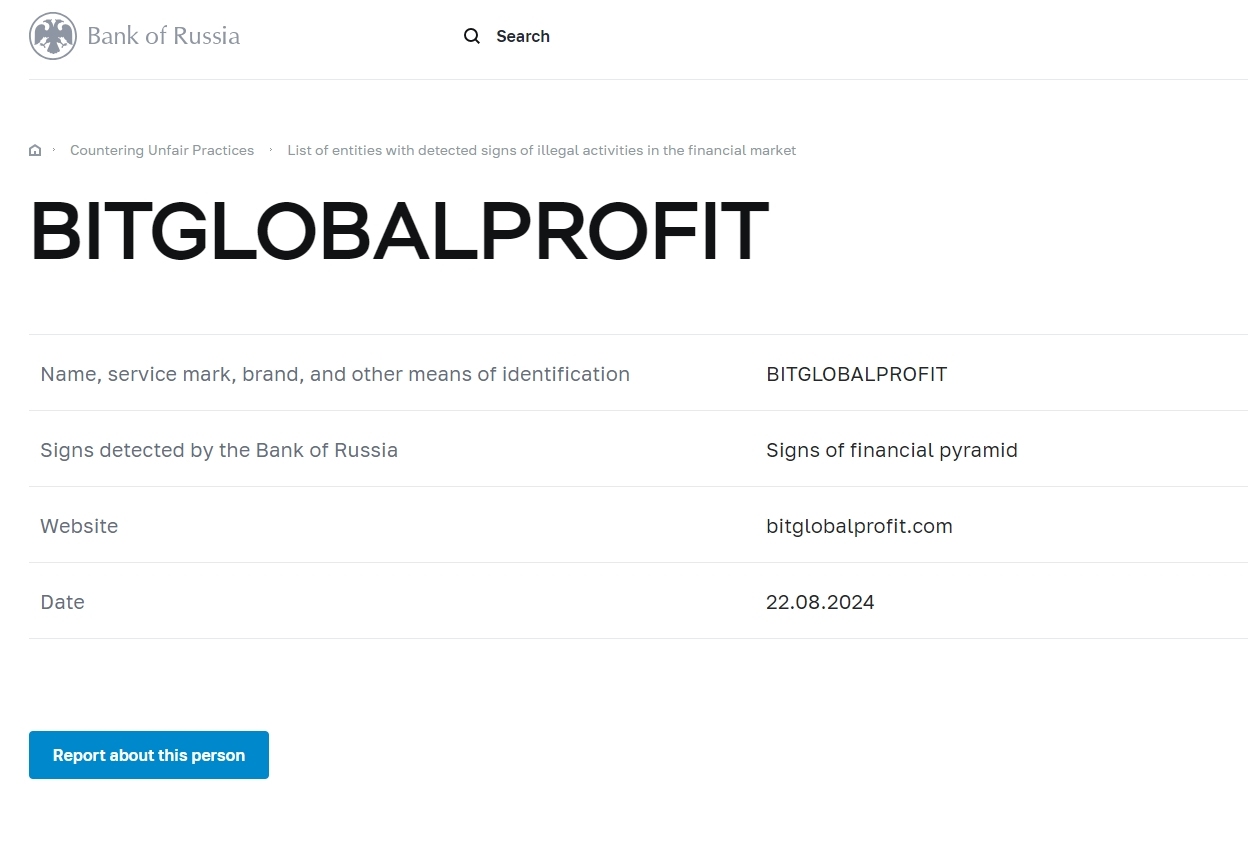 ชื่อ เครื่องหมายการบริการ ยี่ห้อ และวิธีการระบุอื่น ๆ ของ BITGLOBALPROFIT สัญญาณที่ตรวจพบโดยธนาคารแห่งรัสเซีย สัญญาณของพีระมิดทางการเงิน เว็บไซต์ bitglobalprofit.com วันที่ 22.08.2024