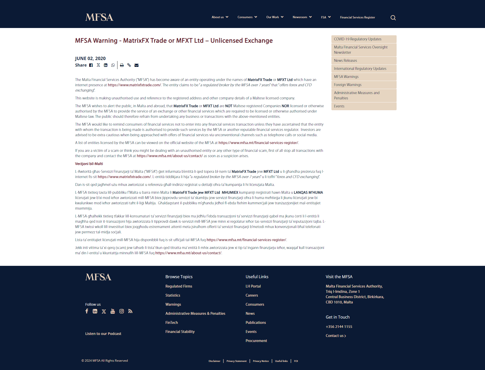 คำเตือนของ MFSA - MatrixFX Trade หรือ mfxt ltd – การแลกเปลี่ยนที่ไม่ได้รับอนุญาต