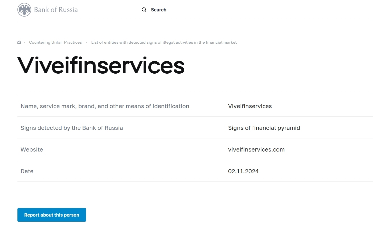 ชื่อ เครื่องหมายการบริการ ยี่ห้อ และสิ่งอื่นๆ ที่ใช้ในการระบุ Viveifinservices สัญญาณที่ตรวจพบโดยธนาคารแห่งรัสเซีย สัญญาณของเว็บไซต์พีระมิดทางการเงิน Viveifinservices .com วันที่ 02.11.2024