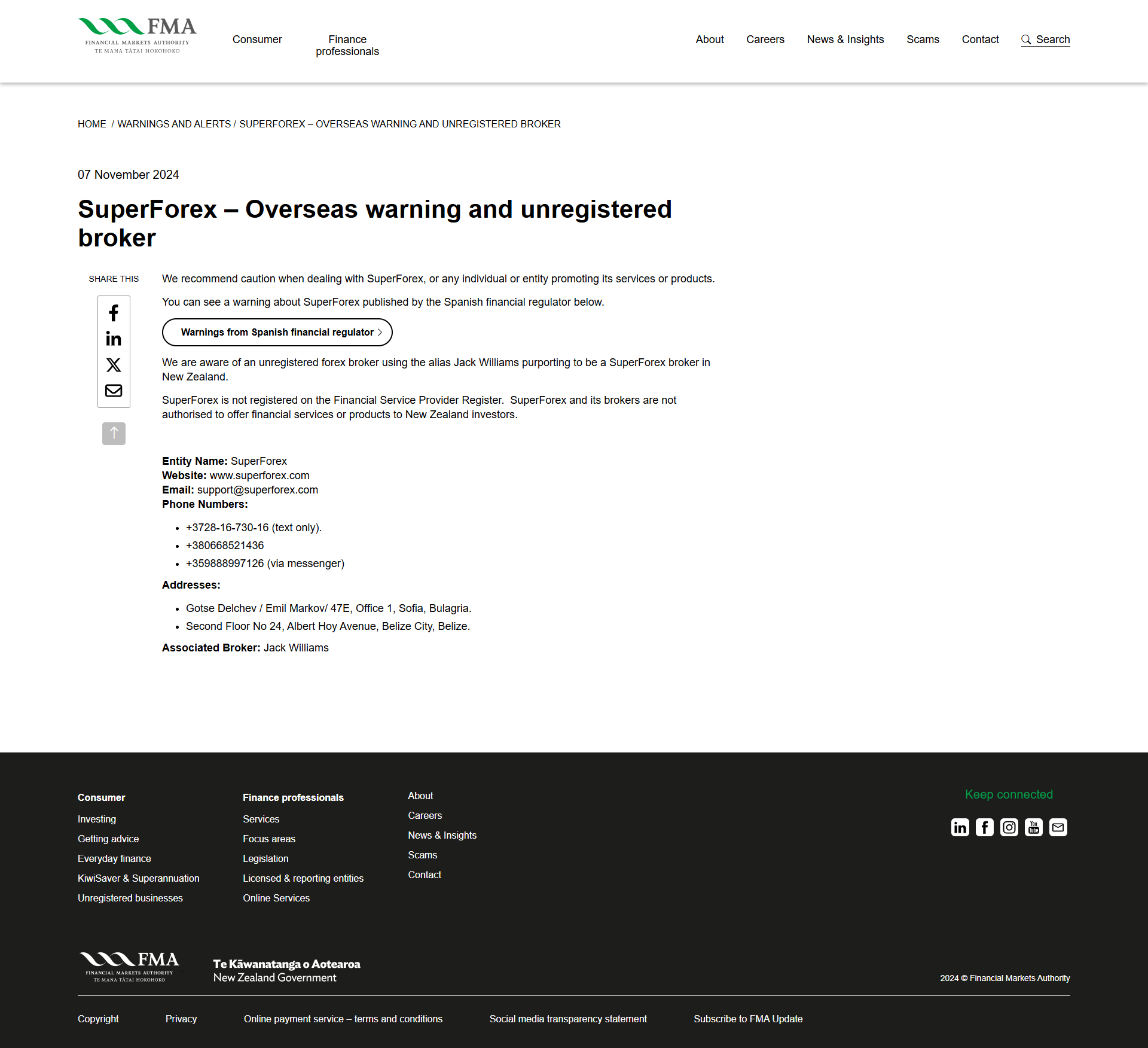 07 พฤศจิกายน 2567 Super Forex – คำเตือนจากต่างประเทศและนายหน้าที่ไม่ได้ลงทะเบียนแบ่งปันสิ่งนี้ เราขอแนะนำให้ระมัดระวังเมื่อทำธุรกรรมกับ Super Forex หรือบุคคลหรือหน่วยงานใดๆ ที่ส่งเสริมบริการหรือผลิตภัณฑ์ของตน คุณสามารถดูคำเตือนเกี่ยวกับ Super Forex เผยแพร่โดยหน่วยงานกำกับดูแลทางการเงินของสเปนด้านล่างนี้ คำเตือนจากหน่วยงานกำกับดูแลทางการเงินของสเปน เรารับทราบเกี่ยวกับโบรกเกอร์ฟอเร็กซ์ที่ไม่ได้ลงทะเบียนซึ่งใช้ชื่อเล่นว่าแจ็ค วิลเลียมส์ โดยแอบอ้างว่าเป็น Super Forex นายหน้าในนิวซีแลนด์ Super Forex ไม่ได้ลงทะเบียนอยู่ในทะเบียนผู้ให้บริการทางการเงิน Super Forex และนายหน้าไม่มีอำนาจเสนอบริการทางการเงินหรือผลิตภัณฑ์ให้กับนักลงทุนนิวซีแลนด์ ชื่อนิติบุคคล: Super Forex เว็บไซต์: www. Super Forex .com อีเมล: support@ Super Forex หมายเลขโทรศัพท์ .com: +3728-16-730-16 (ข้อความเท่านั้น) +380668521436 +359888997126 (ทางเมสเซนเจอร์) ที่อยู่: gotse delchev / emil markov/ 47e, สำนักงาน 1, โซเฟีย, บัลแกเรีย ชั้น 2 หมายเลข 24, ถนนอัลเบิร์ต ฮอย, เมืองเบลีซ, เบลีซ นายหน้าที่เกี่ยวข้อง: แจ็ค วิลเลียมส์