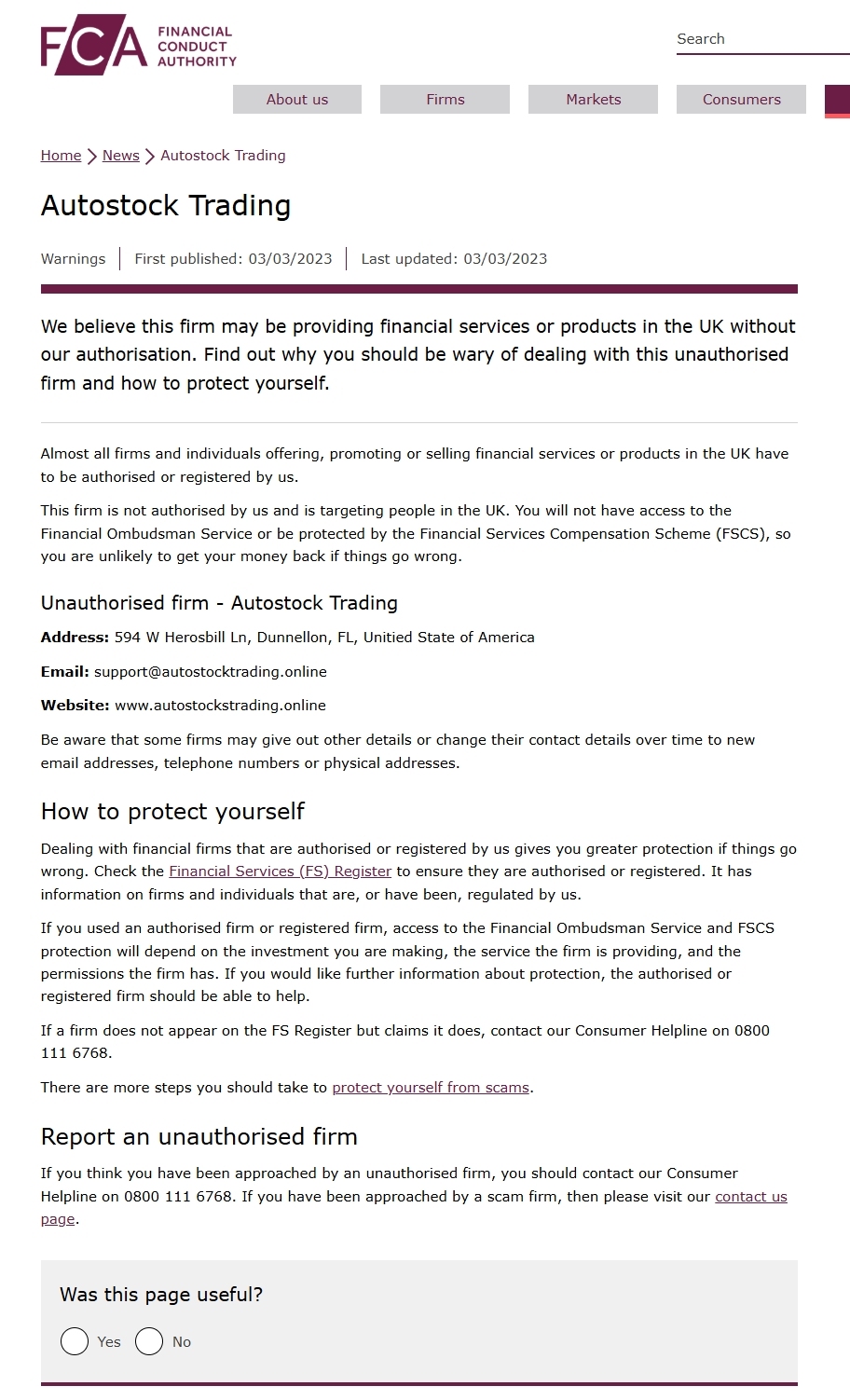 รายชื่อคำเตือนของ FCA เกี่ยวกับบริษัทที่ไม่มีสิทธิ์ Autostock Trading.