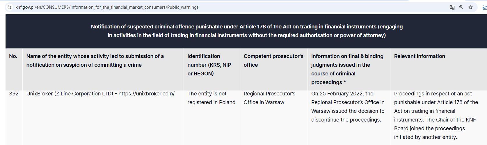 UnixBroker(บริษัท แซดไลน์ คอร์ปอเรชั่น จำกัด) - https:// UnixBroker .com/ นิติบุคคลไม่ได้จดทะเบียนกับสำนักงานอัยการประจำภูมิภาคโปแลนด์ในวอร์ซอ เมื่อวันที่ 25 กุมภาพันธ์ 2022 สำนักงานอัยการประจำภูมิภาคในวอร์ซอได้ออกคำตัดสินยุติการดำเนินคดี การดำเนินคดีเกี่ยวกับการกระทำที่ต้องรับโทษตามมาตรา 178 แห่งพระราชบัญญัติว่าด้วยการซื้อขายตราสารทางการเงิน ประธานคณะกรรมการ KNF เข้าร่วมในการดำเนินคดีที่ริเริ่มโดยนิติบุคคลอื่น
