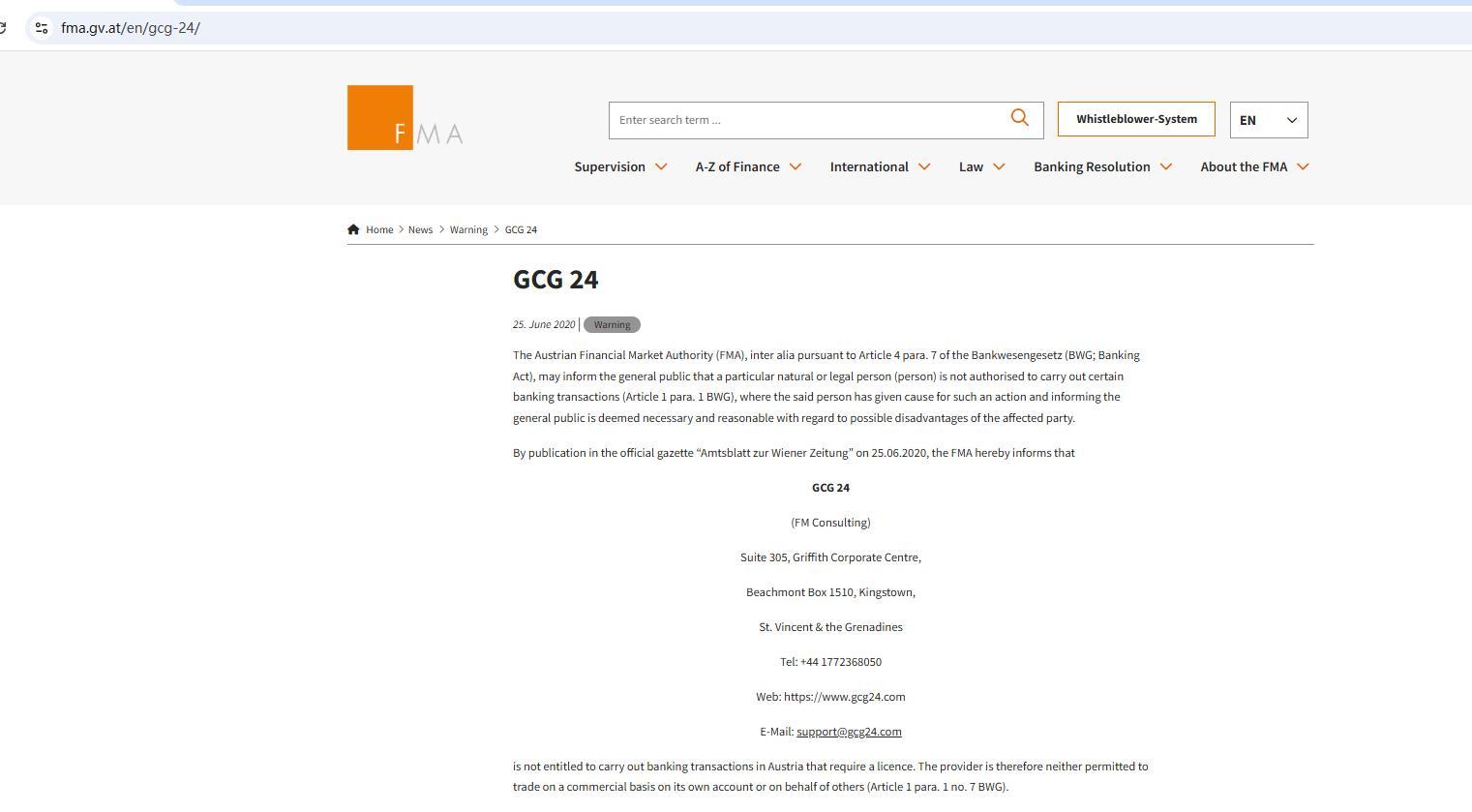 GCG 24วันที่เผยแพร่: 25 มิถุนายน 2020 | หมวดหมู่: คำเตือน สำนักงานตลาดการเงินออสเตรีย (FMA) รวมถึงอื่นๆ ตามมาตรา 4 ย่อหน้า 7 ของ bankwesengesetz (bwg; กฎหมายการธนาคาร) อาจแจ้งให้สาธารณชนทั่วไปทราบว่าบุคคลธรรมดาหรือนิติบุคคล (บุคคล) บางรายไม่มีอำนาจดำเนินการธุรกรรมการธนาคารบางประเภท (มาตรา 1 ย่อหน้า 1 bwg) หากบุคคลดังกล่าวได้ให้เหตุผลในการดำเนินการดังกล่าว และการแจ้งให้สาธารณชนทั่วไปทราบถือเป็นสิ่งจำเป็นและสมเหตุสมผลเกี่ยวกับข้อเสียที่อาจเกิดขึ้นกับฝ่ายที่ได้รับผลกระทบ โดยประกาศในราชกิจจานุเบกษา “amtsblatt zur wiener zeitung” เมื่อวันที่ 25.06.2020 สำนักงานตลาดการเงินออสเตรียขอแจ้งให้ทราบว่า GCG 24 (fm consulting) suite 305, griffith corporate centre, beachmont box 1510, kingstown, st. vincent & the grenadines โทร: +44 1772368050 เว็บ: https://www.gcg24.com อีเมล: support@gcg24.com ไม่มีสิทธิ์ทำธุรกรรมการธนาคารในออสเตรียที่ต้องมีใบอนุญาต ดังนั้น ผู้ให้บริการจึงไม่ได้รับอนุญาตให้ซื้อขายในเชิงพาณิชย์ในบัญชีของตนเองหรือในนามของผู้อื่น (มาตรา 1 ย่อหน้า 1 หมายเลข 7 bwg)
