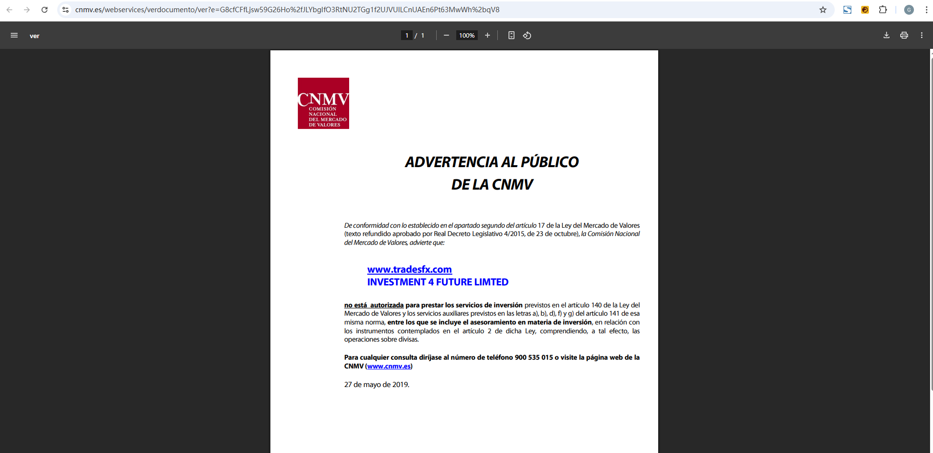ประกาศให้สาธารณชนทราบจาก CNMV ตามบทบัญญัติของมาตรา 17 ส่วนที่ 2 แห่งพระราชบัญญัติตลาดหลักทรัพย์ (ข้อความรวมที่ได้รับการอนุมัติโดยพระราชกฤษฎีกา 4/2015 เมื่อวันที่ 23 ตุลาคม) สำนักงานคณะกรรมการกำกับตลาดหลักทรัพย์แห่งชาติเตือนว่า: www. TradesFX บริษัท .com Investment 4 Future Limited ไม่มีอำนาจให้บริการด้านการลงทุนตามมาตรา 140 ของกฎหมายตลาดหลักทรัพย์ และบริการเสริมตามตัวอักษร a), b), d), f) และ g) ของมาตรา 141 ของกฎหมายเดียวกัน ซึ่งรวมถึงคำแนะนำด้านการลงทุนที่เกี่ยวข้องกับเครื่องมือที่กำหนดไว้ในมาตรา 2 ของกฎหมายดังกล่าว รวมถึงเพื่อจุดประสงค์นี้ การทำธุรกรรมสกุลเงิน หากมีคำถามใดๆ โปรดโทร 900 535 015 หรือเยี่ยมชมเว็บไซต์ CNMV (www.cnmv.es) 27 พฤษภาคม 2019