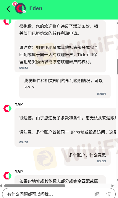 ทุกคนโปรดระวังผู้หลอกลวงรายนี้ บริษัท Tickmill เปิดตัวโปรโมชั่น "ฝากเงิน 10,000 ริงกิต รับโบนัส 5,000 ริงกิต" ผมฝากเงิน 20,000 ริงกิตและได้รับโบนัส 10,000 ริงกิต กฎของโปรโมชั่นระบุว่า "ปลดล็อกโบนัสหลังจากทำยอดเทรดครบ 200 เท่า" ผมเข้าใจว่าสามารถรับโบนัสได้ทีละน้อยด้วยการเทรดตามปกติ แต่ในเดือนธันวาคม หลังจากทำกำไรได้ เมื่อผมยื่นขอถอนเงินต้น 15,000 ริงกิต กลับได้รับแจ้งว่า "เงินต้นถูกผูกกับโบนัส คุณต้องทำยอดเทรดครบ 300 เท่าจึงจะถอนเงินได้" พวกเขาปิดบัญชีของผมและยึดเงิน 3,718 ดอลลาร์สหรัฐที่อยู่ในบัญชี โดยอ้างว่าผมละเมิดกฎข้อ 8 แต่ผมไม่ได้ทำอะไรผิด ผมไม่ได้ทำอะไรเลย ผมติดต่อพวกเขาหลายครั้ง แต่พวกเขาบอกว่าเป็นนโยบายของบริษัท ทำไมพวกเขาถึงโกงผม? ผมหวังว่าพวกเขาจะคืนเงินและเตือนผม