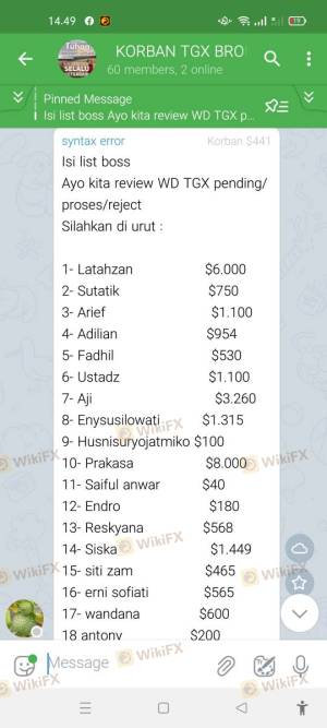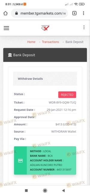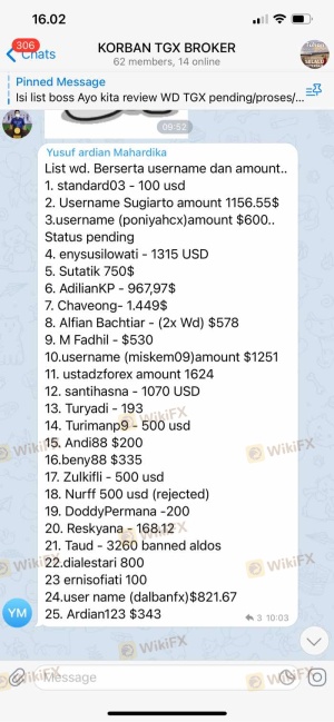 ฉันเริ่มเทรดบน TGX ตั้งแต่เดือนพฤศจิกายน 2020 ทุกอย่างยังปลอดภัยสำหรับกระบวนการฝากเงินและถอนเงิน และยังรวดเร็วด้วย จนถึงสิ้นเดือนมกราคมหลังจากที่หนึ่งใน LDs ของพวกเขาหนีไปกับเงิน (ไม่ใช่ LD ของฉัน) จากนั้นกระบวนการถอนเงินที่ TGX ก็ถูกบล็อกไป นักเทรดชาวอินโดนีเซียทั้งหมดถูกห้ามเข้าสู่แดชบอร์ดเว็บของพวกเขาและถอนเงินทั้งหมดถูกปฏิเสธและถือเงินไว้ RO TGX แจ้งให้เราส่งอีเมลไปยัง HQ แต่หลังจากที่ลูกค้าส่งอีเมลถามเกี่ยวกับกระบวนการถอนเงินของพวกเขา จากนั้นบัญชีลูกค้าทั้งหมดถูกห้ามใช้งาน