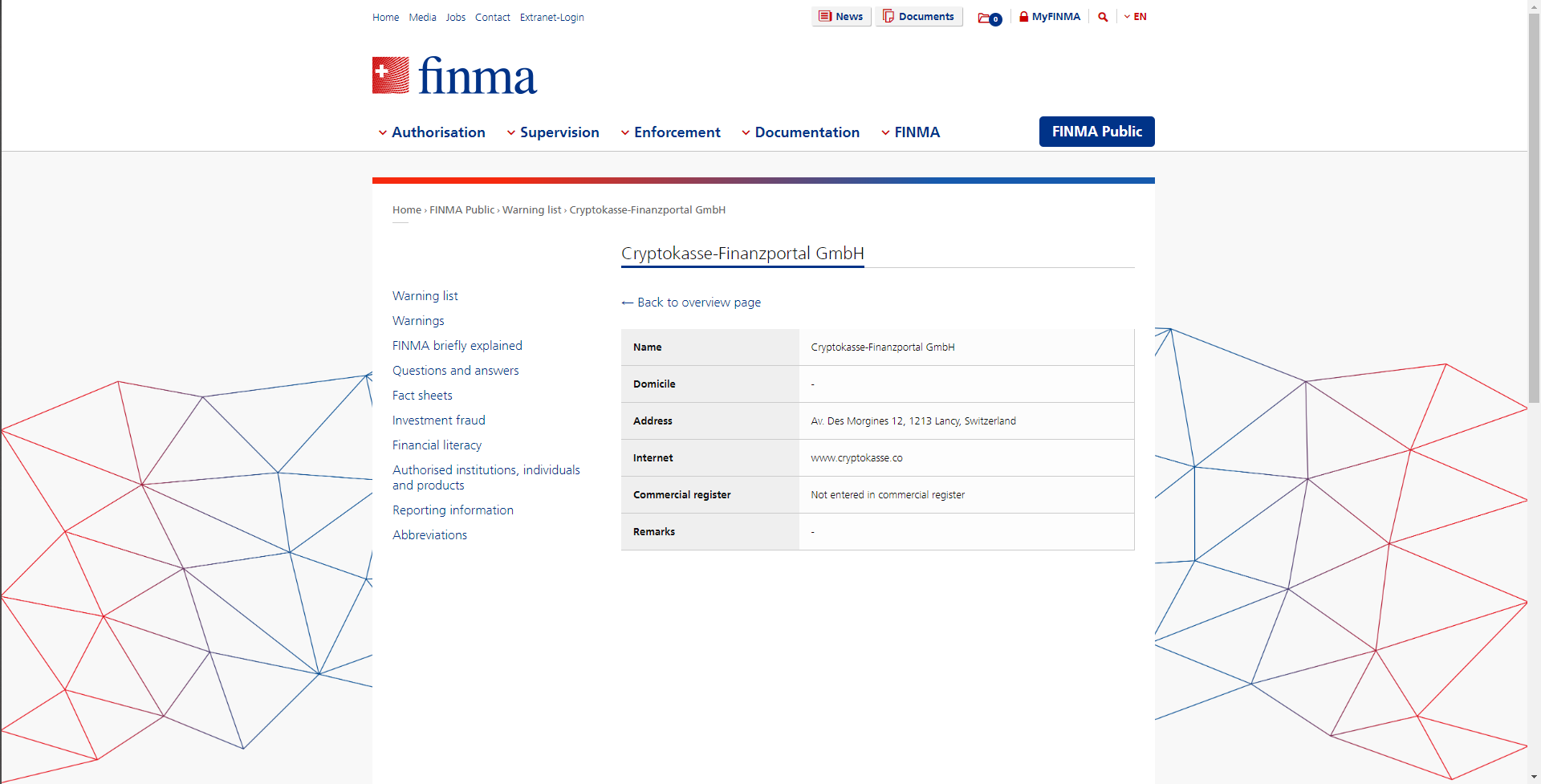 รายชื่อเตือนบริษัทและบุคคลที่ไม่มีอำนาจ Cryptokasse-Finanzportal GmbH.