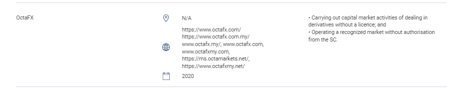 "ส่วนนี้ประกอบด้วยรายชื่อเว็บไซต์ที่ไม่ได้รับอนุญาต ผลิตภัณฑ์การลงทุน บริษัท และบุคคล รายชื่อนี้รวมถึง: บุคคลที่ดำเนินการหรือถือตนว่าดำเนินกิจกรรมที่มีการควบคุมต่อไปนี้โดยไม่ได้รับอนุญาตจาก sc: การซื้อขายหลักทรัพย์ การซื้อขายตราสารอนุพันธ์ การจัดการกองทุน การให้คำปรึกษาทางการเงินขององค์กร การให้คำปรึกษาด้านการลงทุน การวางแผนทางการเงิน และการจัดการโครงการเกษียณอายุส่วนบุคคล บุคคลที่ดำเนินกิจการในตลาดที่เป็นที่ยอมรับโดยไม่ได้รับอนุญาต บุคคลที่ออกหรือเสนอขายหลักทรัพย์โดยไม่ได้รับอนุญาต อนุญาต หรือรับรอง บุคคลที่ใช้โลโก้ของ SC ในทางที่ผิดและบิดเบือนความจริงของ SC " OctaFX ไม่มี https://www. OctaFX .com/ https://www. OctaFX .com.my/www. OctaFX .my/, www. OctaFX .com, www. OctaFX my.com, https://ms.octamarkets.net/, https://www. OctaFX my.net/ 2563 • ดำเนินกิจกรรมตลาดทุนในการซื้อขายตราสารอนุพันธ์โดยไม่ได้รับใบอนุญาต และ • ดำเนินการตลาดที่เป็นที่ยอมรับโดยไม่ได้รับอนุญาตจากวท.