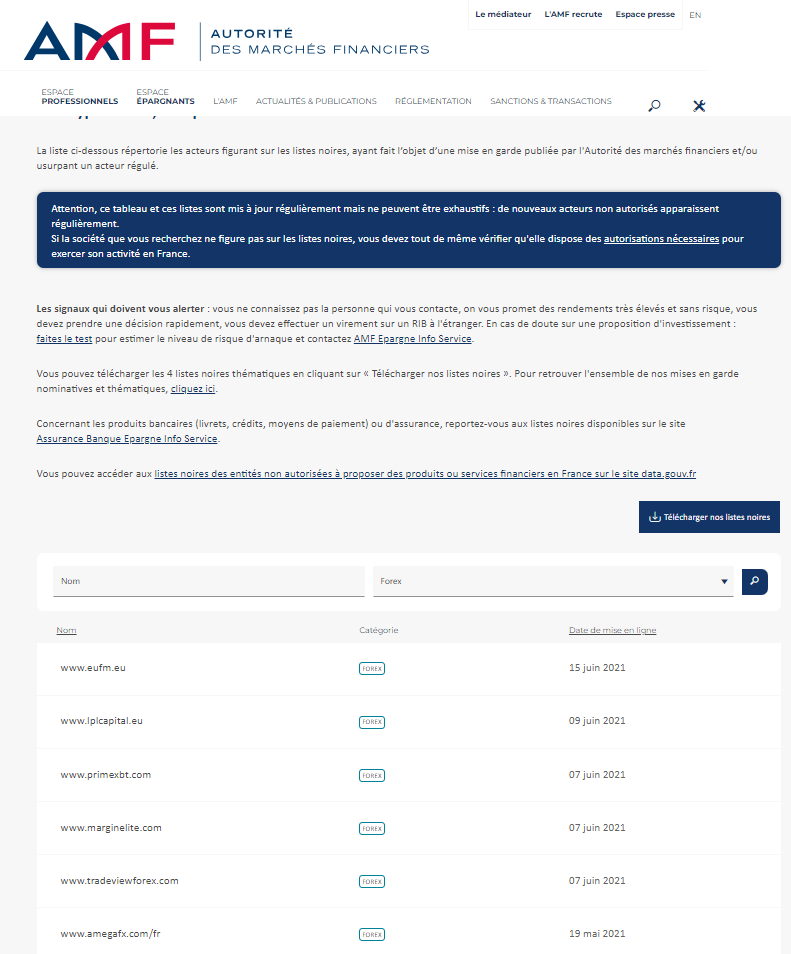 นี่คือรายชื่อบริษัทหรือเว็บไซต์ในบัญชีดำของ Autorité des Marchés Financiers (AMF) คำเตือนและ/หรือการแย่งชิงบริษัทที่ได้รับการควบคุม