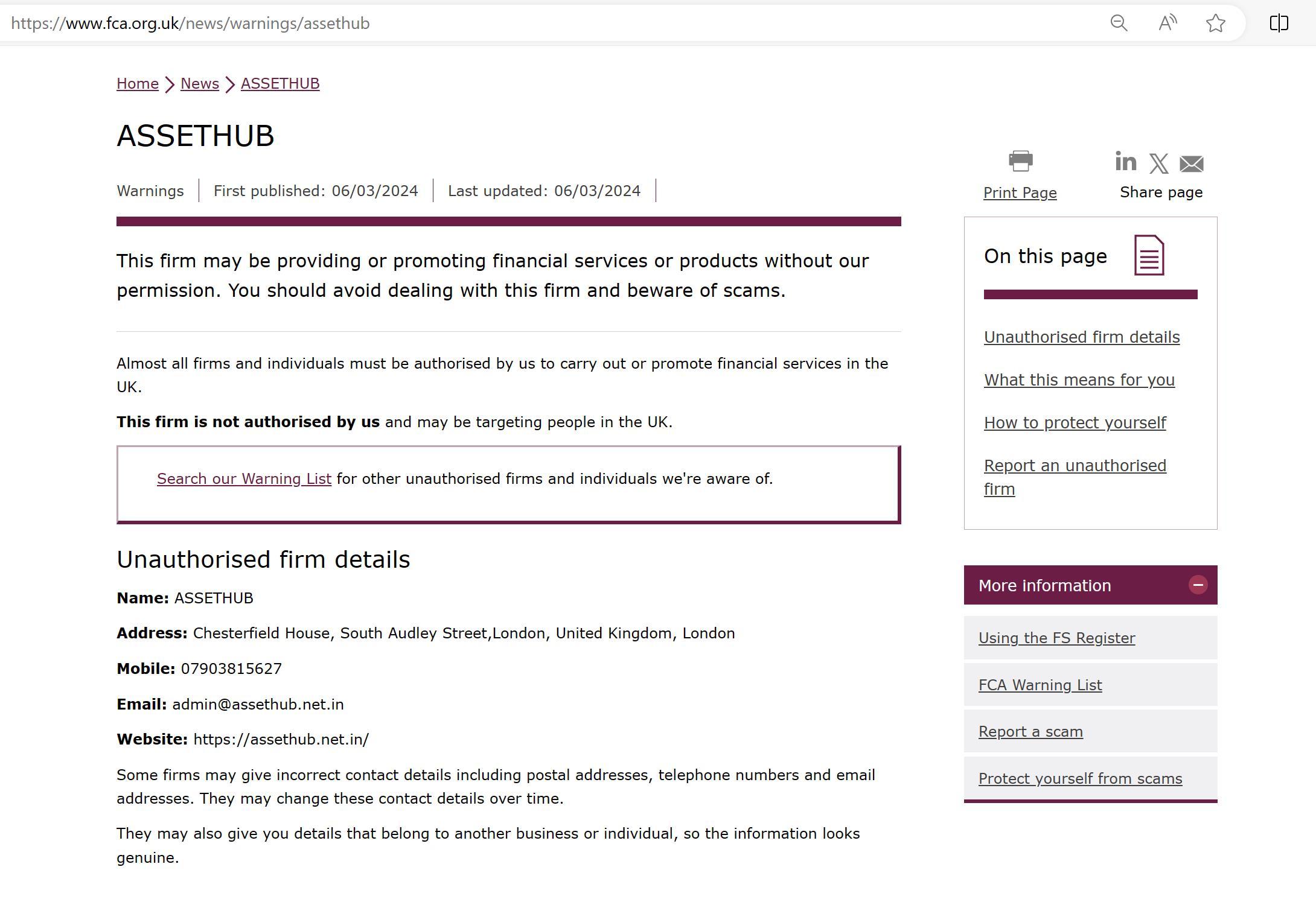 รายชื่อเตือนจาก FCA เกี่ยวกับบริษัทที่ไม่มีอนุญาต ASSETHUB.