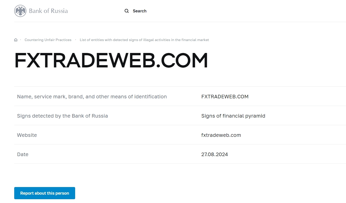 ชื่อ เครื่องหมายการบริการ ยี่ห้อ และวิธีการระบุอื่น ๆ FXTRADEWEB.COM ป้ายที่ตรวจพบโดยธนาคารแห่งรัสเซีย ป้ายของพีระมิดทางการเงิน เว็บไซต์ fxtradeweb.com วันที่ 27.08.2024