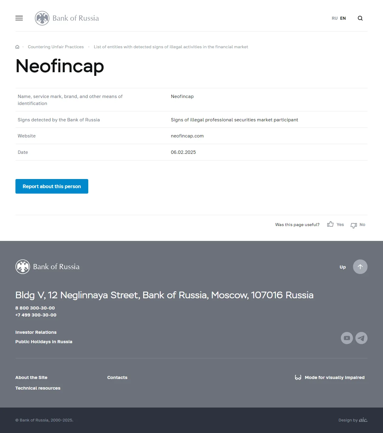 ชื่อ, เครื่องหมายบริการ, แบรนด์ และวิธีการระบุตัวตนอื่น ๆ Neofincap สัญญาณที่ตรวจพบโดยธนาคารกลางรัสเซีย สัญญาณของผู้เข้าร่วมตลาดหลักทรัพย์ที่ประกอบวิชาชีพอย่างผิดกฎหมาย เว็บไซต์ neofincap.com วันที่ 06.02.2025.