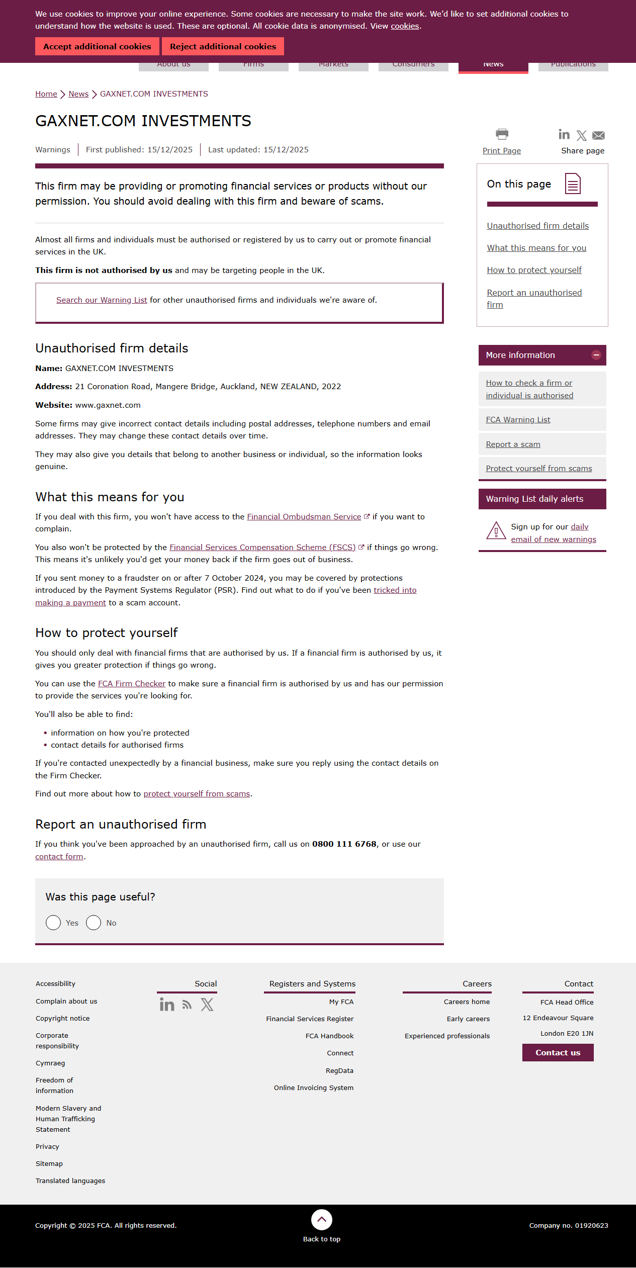 บริษัทนี้อาจให้บริการหรือส่งเสริมบริการหรือผลิตภัณฑ์ทางการเงินโดยไม่ได้รับอนุญาตจากเรา คุณควรหลีกเลี่ยงการติดต่อกับบริษัทนี้และระวังการหลอกลวง บริษัทและบุคคลเกือบทั้งหมดต้องได้รับอนุญาตหรือจดทะเบียนกับเราจึงจะสามารถดำเนินการหรือส่งเสริมบริการทางการเงินในสหราชอาณาจักรได้ บริษัทนี้ไม่ได้รับอนุญาตจากเราและอาจกำลังกำหนดเป้าหมายไปที่ผู้คนในสหราชอาณาจักร ค้นหารายชื่อบริษัทและบุคคลที่ไม่ได้อนุญาตอื่นๆ ที่เราทราบในรายการเตือนของเรา รายละเอียดบริษัทที่ไม่ได้อนุญาต ชื่อ: GAXNET.COM INVESTMENTS ที่อยู่: 21 Coronation Road, Mangere Bridge, Auckland, NEW ZEALAND, 2022 เว็บไซต์: www.gaxnet.com บางบริษัทอาจให้รายละเอียดการติดต่อที่ไม่ถูกต้อง รวมถึงที่อยู่ไปรษณีย์ หมายเลขโทรศัพท์ และที่อยู่อีเมล ซึ่งอาจเปลี่ยนแปลงรายละเอียดการติดต่อเหล่านี้เมื่อเวลาผ่านไป และอาจให้รายละเอียดที่เกี่ยวข้องกับบุคคลอื่นแก่คุณ ธุรกิจหรือบุคคล ดังนั้นข้อมูลจึงดูเหมือนจริง.
